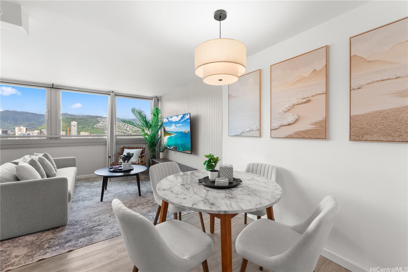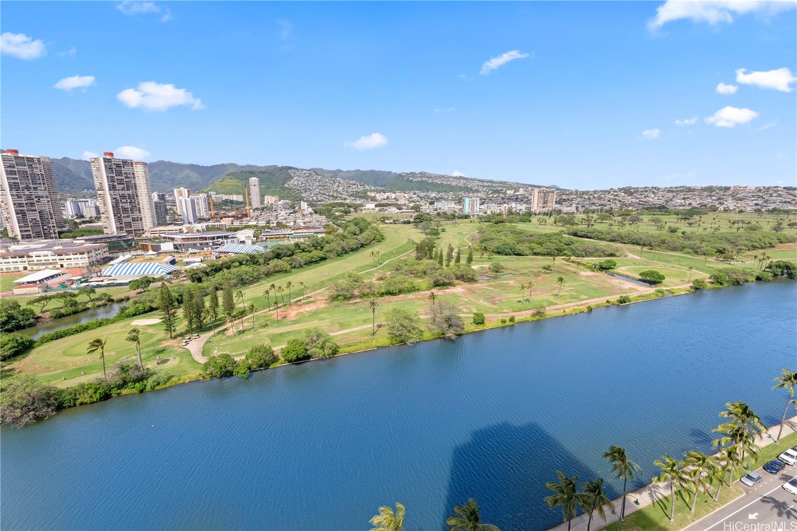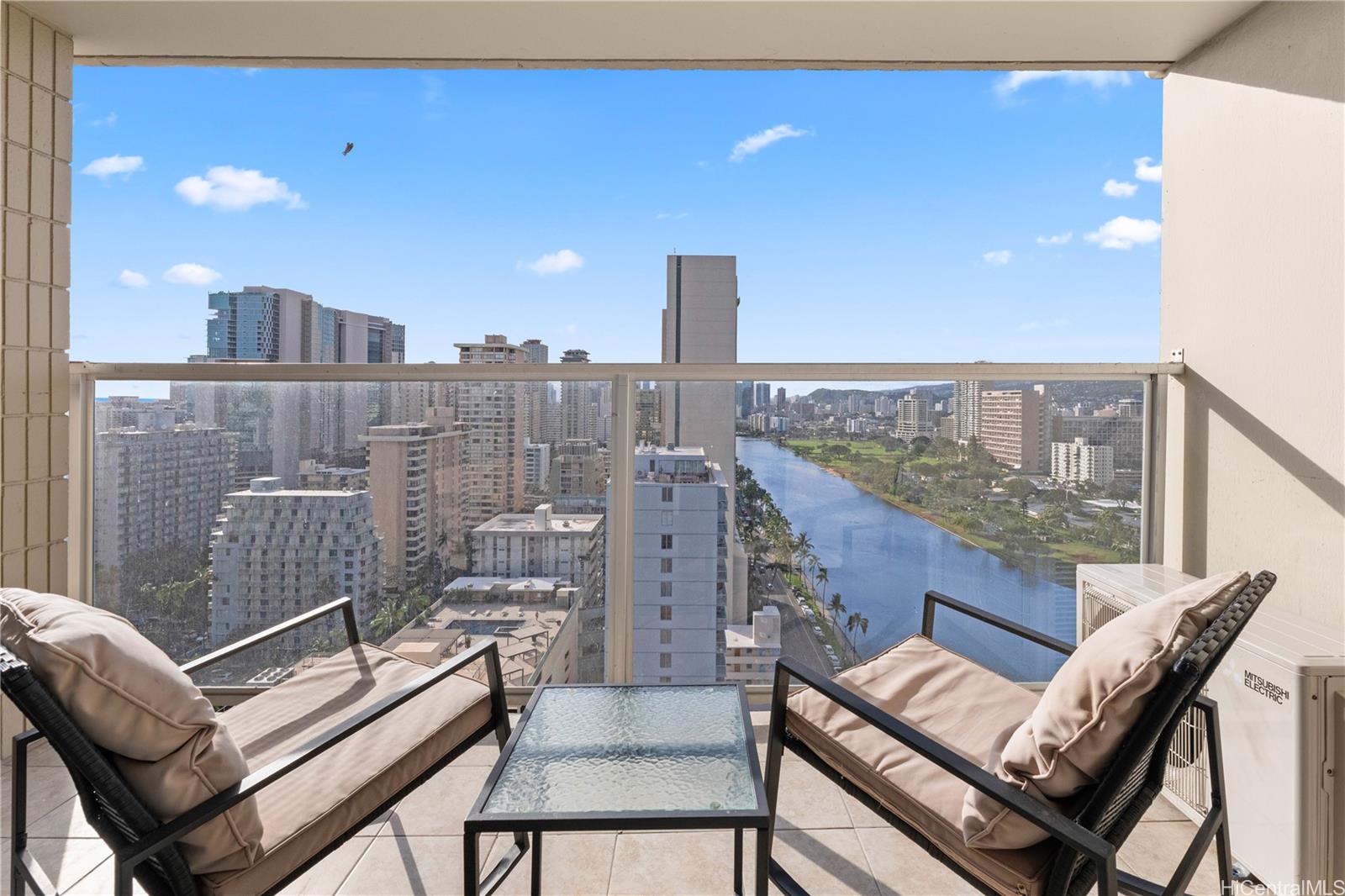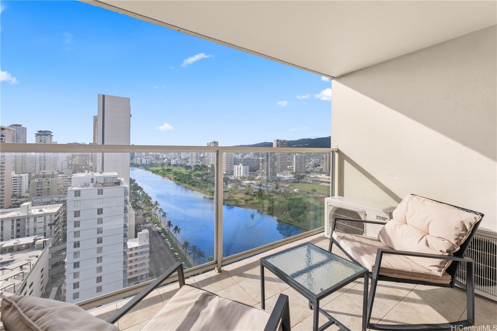 Take in sweeping mountain views from the living space, while the private lanai captures tranquil Ala Wai Canal scenery with a touch of ocean on the horizon—perfect for relaxing or entertaining.