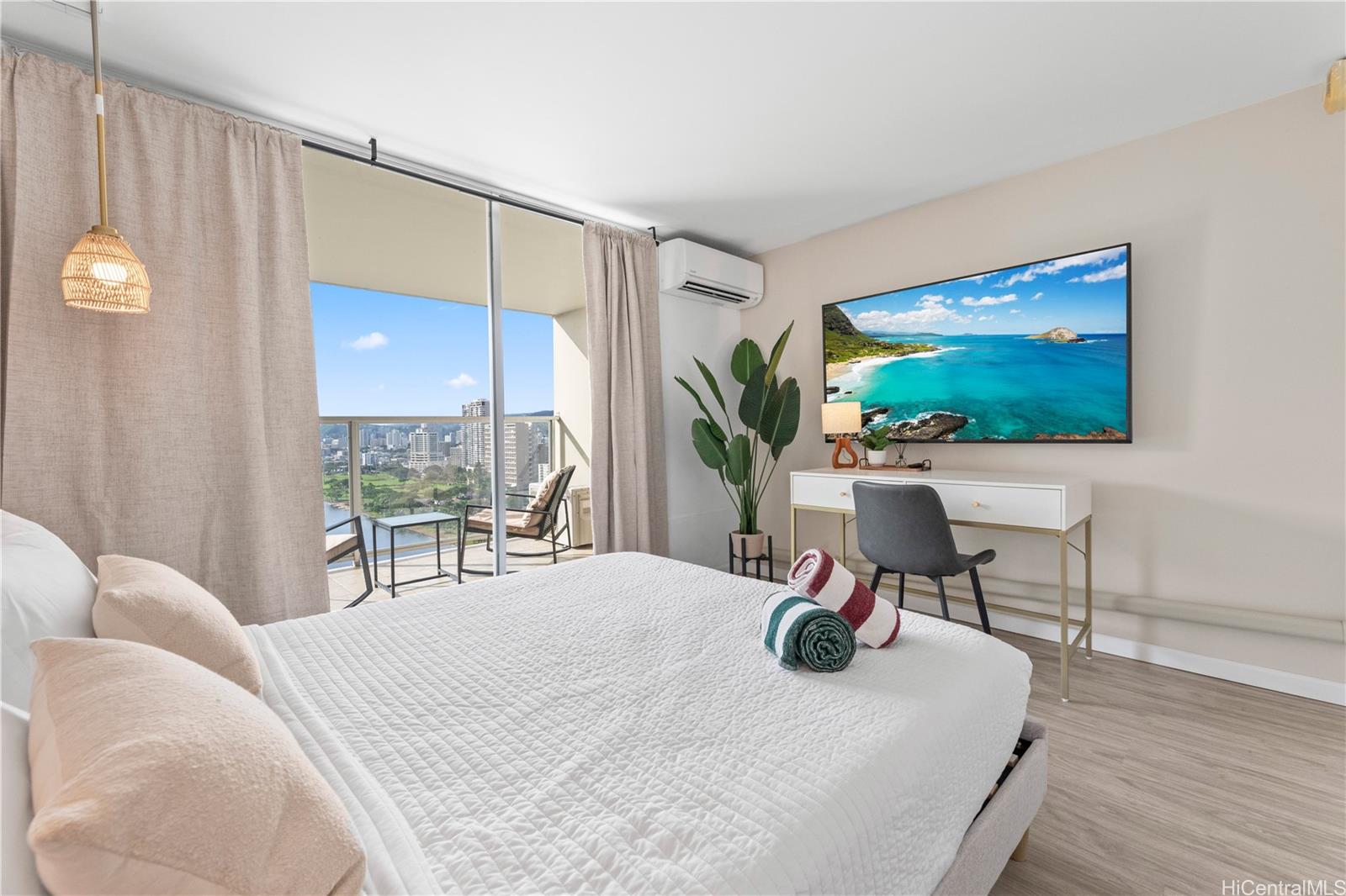 アイランドコロニーの、センス良く改装された高層階の1ベッドルーム/1バスルームのレジデンスで、ワンランク上のアイランドライフをご体験ください。人気の高い短期レンタル(STR)物件であるこのユニットは、抜群の柔軟性と高い収益性を誇り、リビングルームとベッドルームの両方にスプリットエアコンが設置されているため、快適な滞在をお約束します。リビングスペースからは雄大な山々の景色が広がり、プライベートラナイからは、静かなアラワイ運河の景色と、地平線に広がる海の景色をお楽しみいただけます。リラックスしたり、ゲストをもてなしたりするのに最適です。活気あふれるワイキキの中心部に位置し、世界的に有名なビーチ、高級ショッピング、一流レストラン、そして数えきれないほどのエンターテイメントに囲まれています。アラモアナ、カカアコ、カハラ、ダイヤモンドヘッドなどへのアクセスも抜群です。フルターンキー方式で提供されるこのレジデンスは、ゲストの体験を向上させ、レンタル収益を最大化するように設計されたスマートで効率的な寝室レイアウトが特徴で、投資家にも、プライベートなアイランドエスケープを求める方にも最適です。アイランドコロニーには、プール、ジャグジー、サウナ、バーベキューエリア、フィットネスセンター、ロビーの集会スペースなど、リゾートスタイルのアメニティが揃っています。 24時間体制のセキュリティで、安心してお過ごしいただけます。