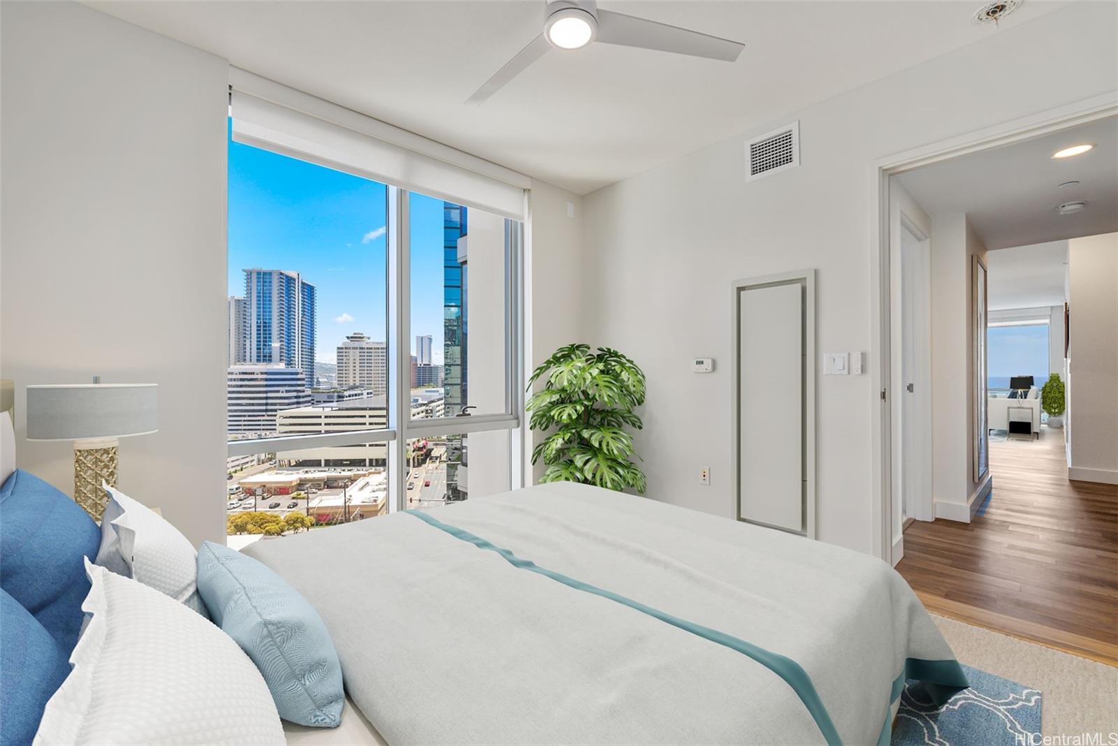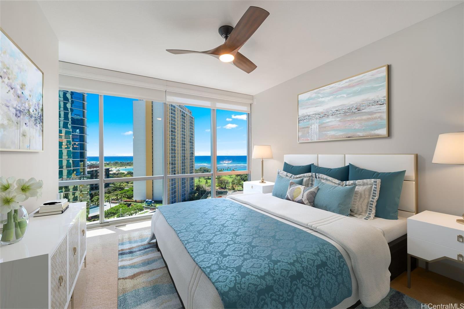 Enjoy the coastal lifestyle of Waihonua - 3 bedroom, 2 bathroom ocean view, corner unit in the prestigious Ala Moana, Ward Village area in the heart of Honolulu. The unit is beautifully upgraded with European designer countertops, new appliances, designer lighting fixtures, fully built-in closet systems, seamless blackout blinds and new plumbing fixtures! World class amenities include: chef's kitchen in club room, fitness center, yoga and private workout studio, spa, pool, theater, BBQ cabanas & guest suites! All in a perfect location for an active lifestyle, steps away from Ala Moana beach, Whole Foods, shopping & restaurants! 3-bedrooms are rarely available at this great value!
