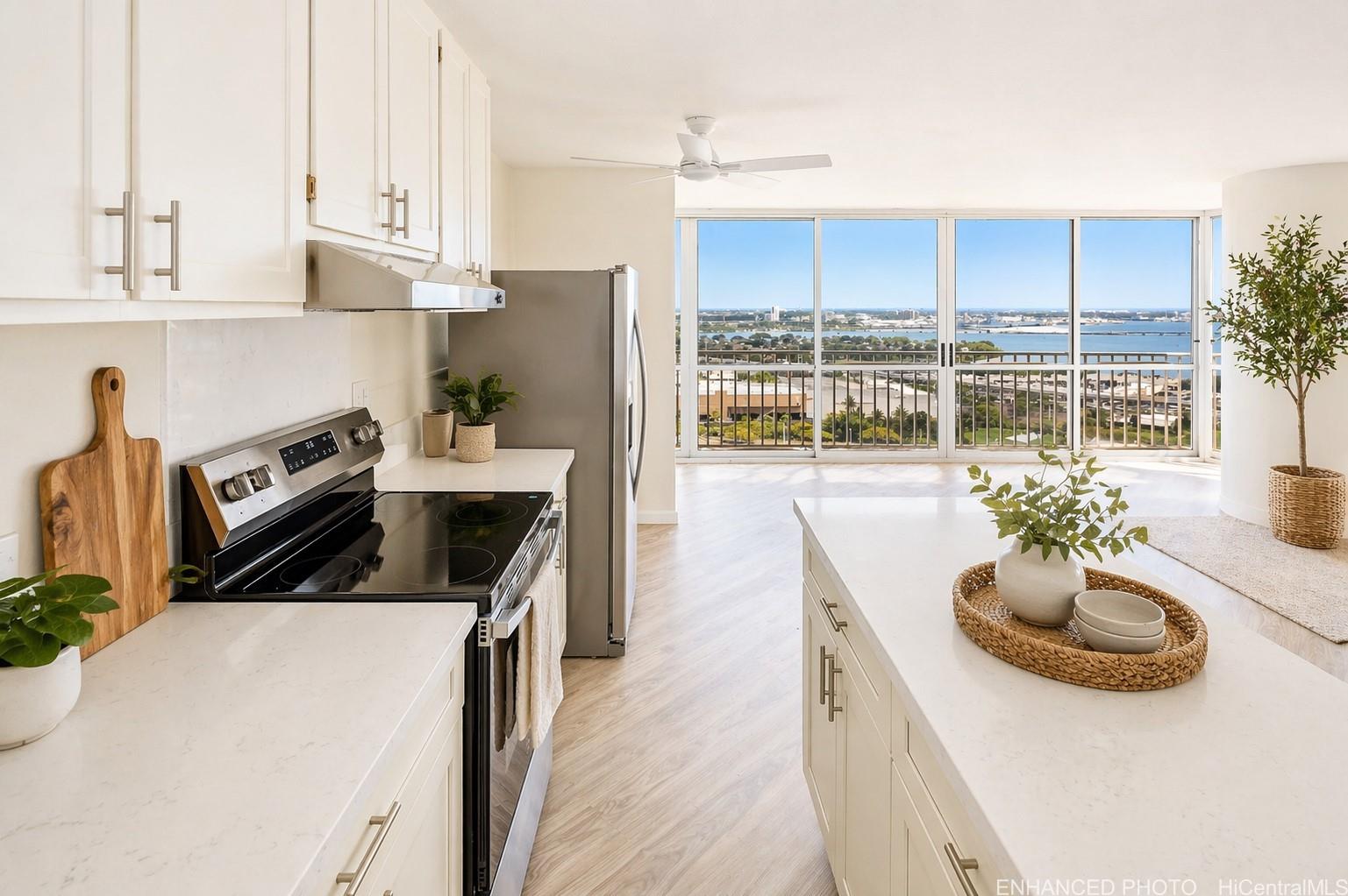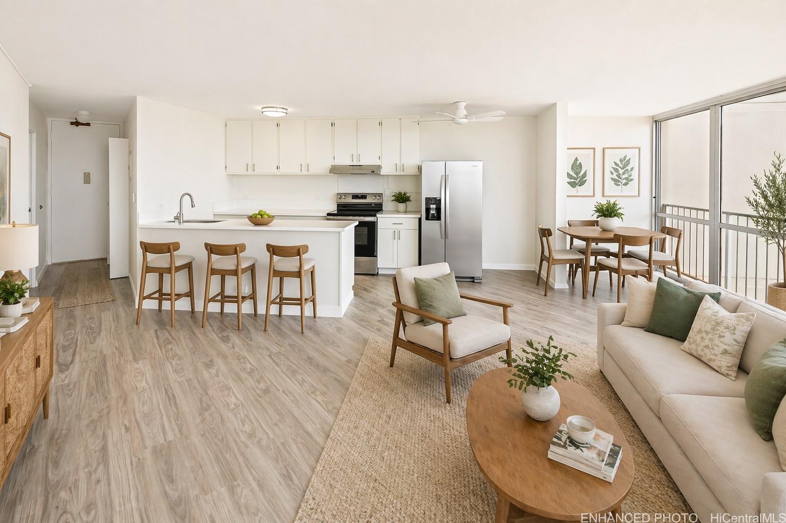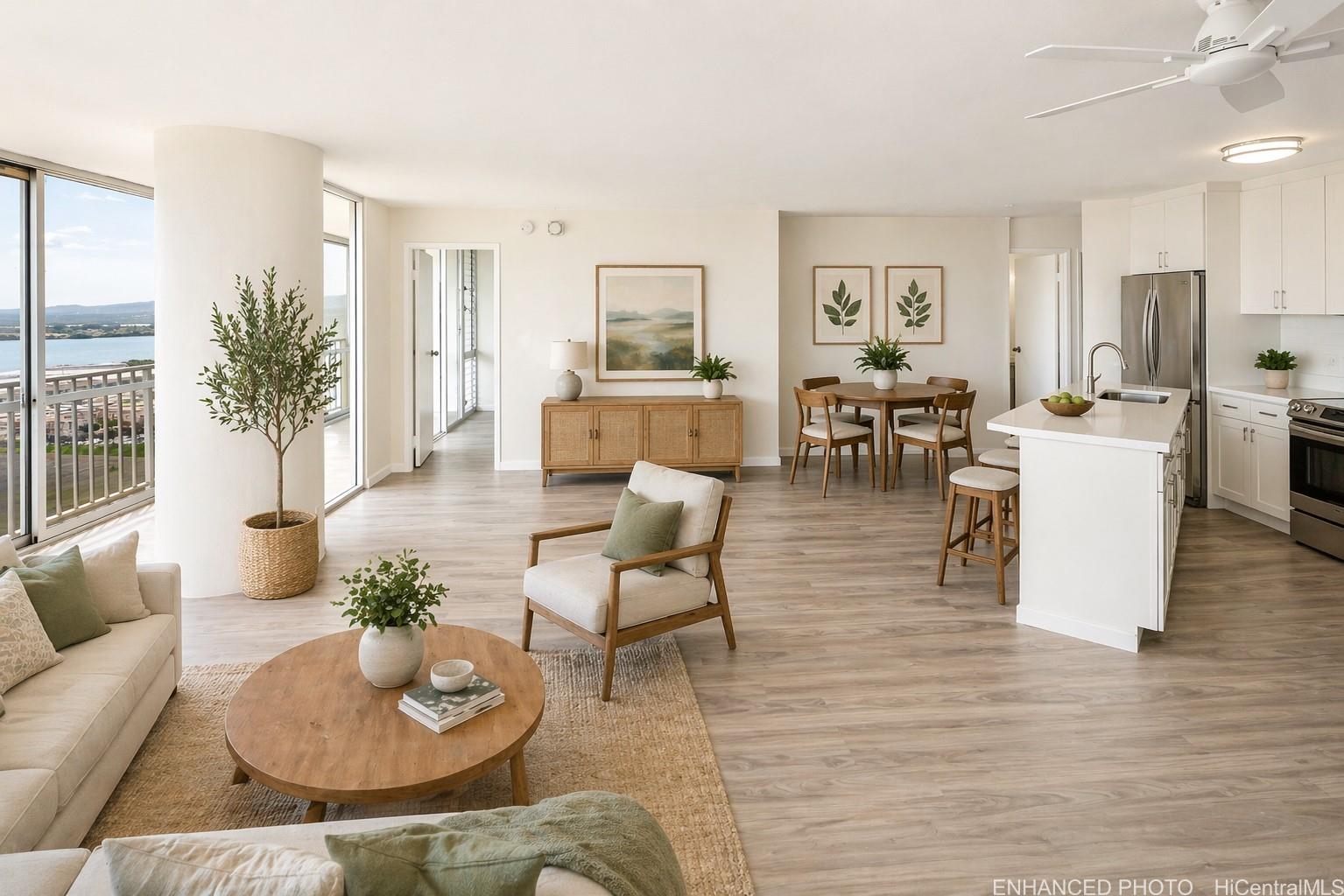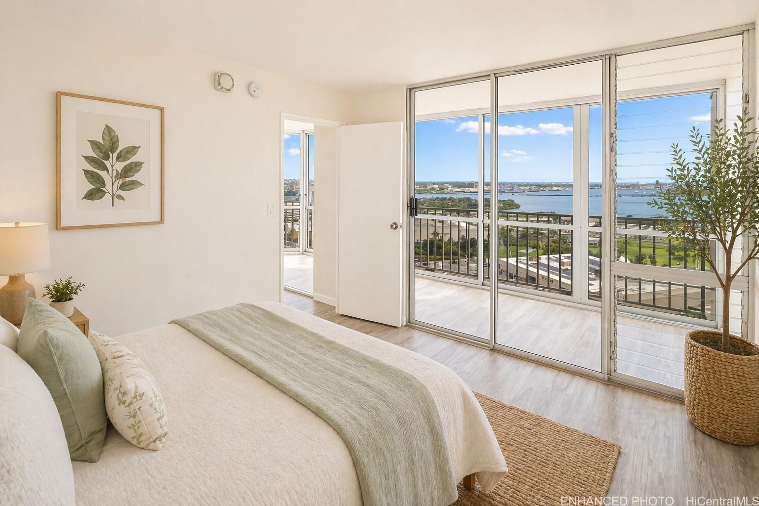covered parking stalls. It presents a spectacular, priceless view of the coastline, mountains and surrounding areas. This special condo is the essence of comfort, convenience and value. New carpeting and interior painting bring visible sparkle to interior walls and flooring awaiting your personal touches. It is conveniently located across the street from Pearlridge Shopping Center, with quick access to H-1 freeway, new Skyline rail station, airport, Pearl Harbor, schools, banks, Pali Momi Hospital, golfing, bus routes, great restaurants and other nearby businesses. This gated community is pet-friendly (verify), well-maintained, and offers security, onsite resident manager, ample guest parking, spacious pool area, assigned storage locker, trash chute on each floor, 3 elevators, and a BBQ area. Fire safety components are installed in each condo unit to enhance occupant's safety. Condo unit sold "as is". See It Today!