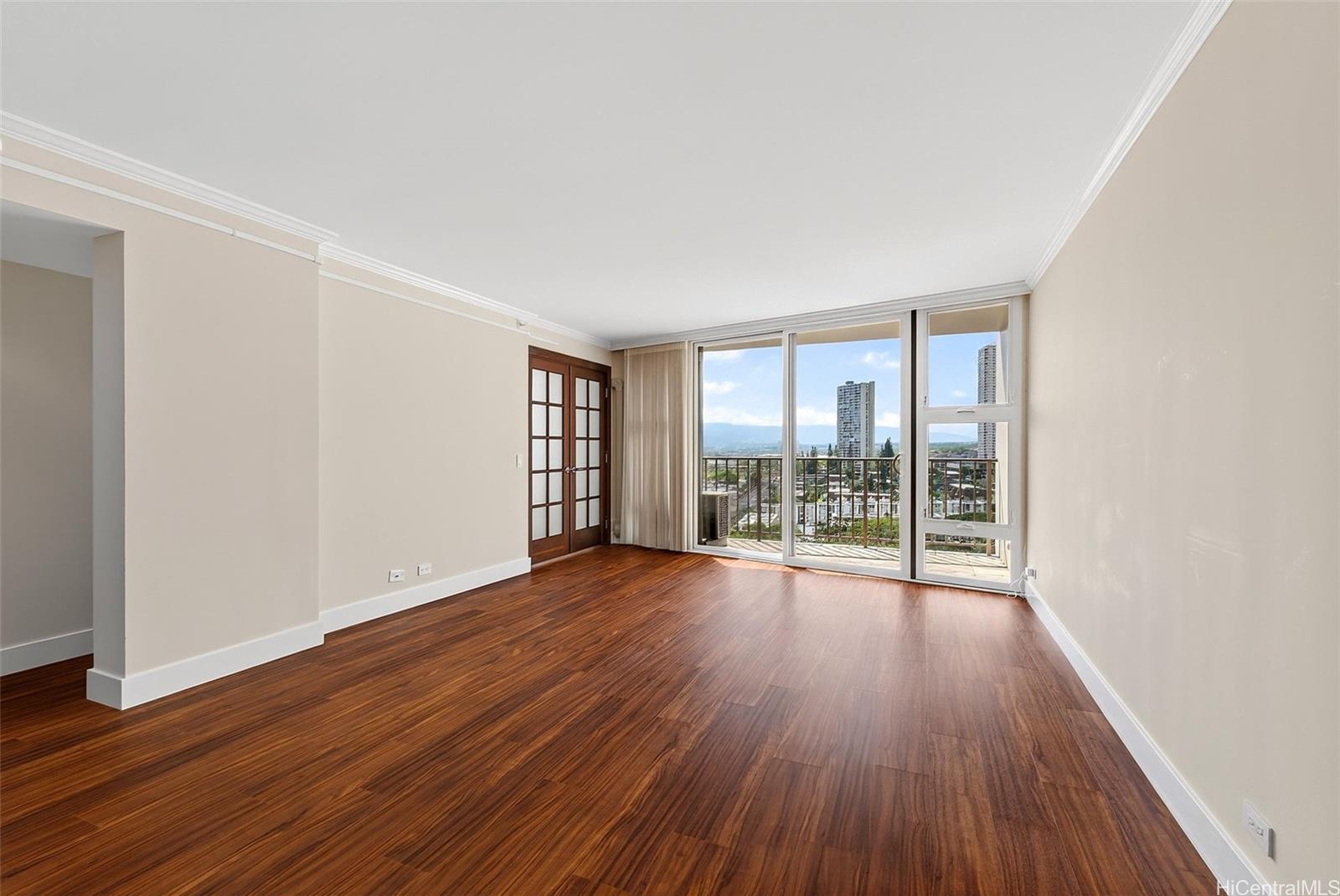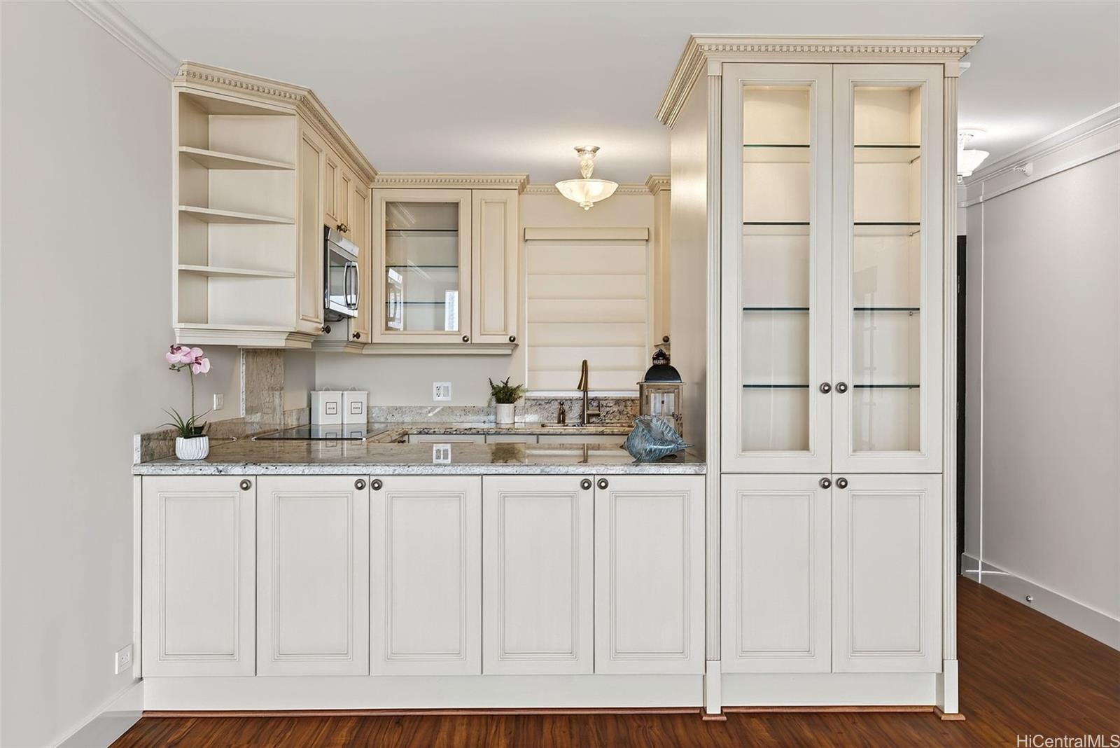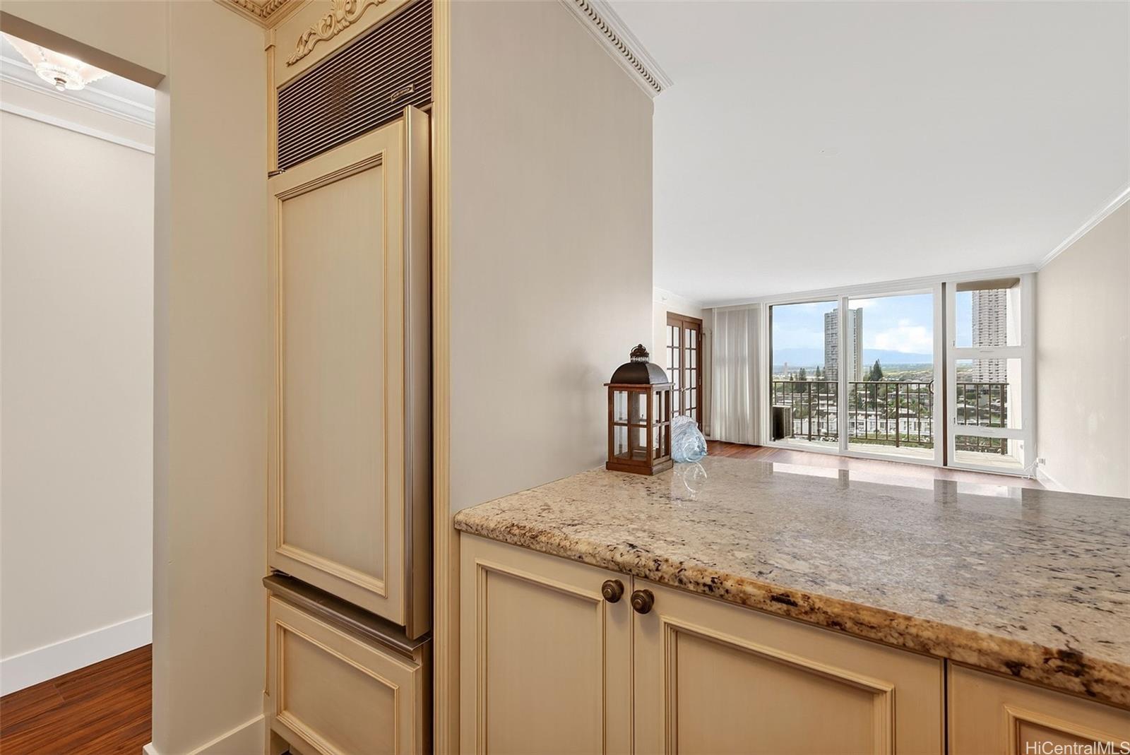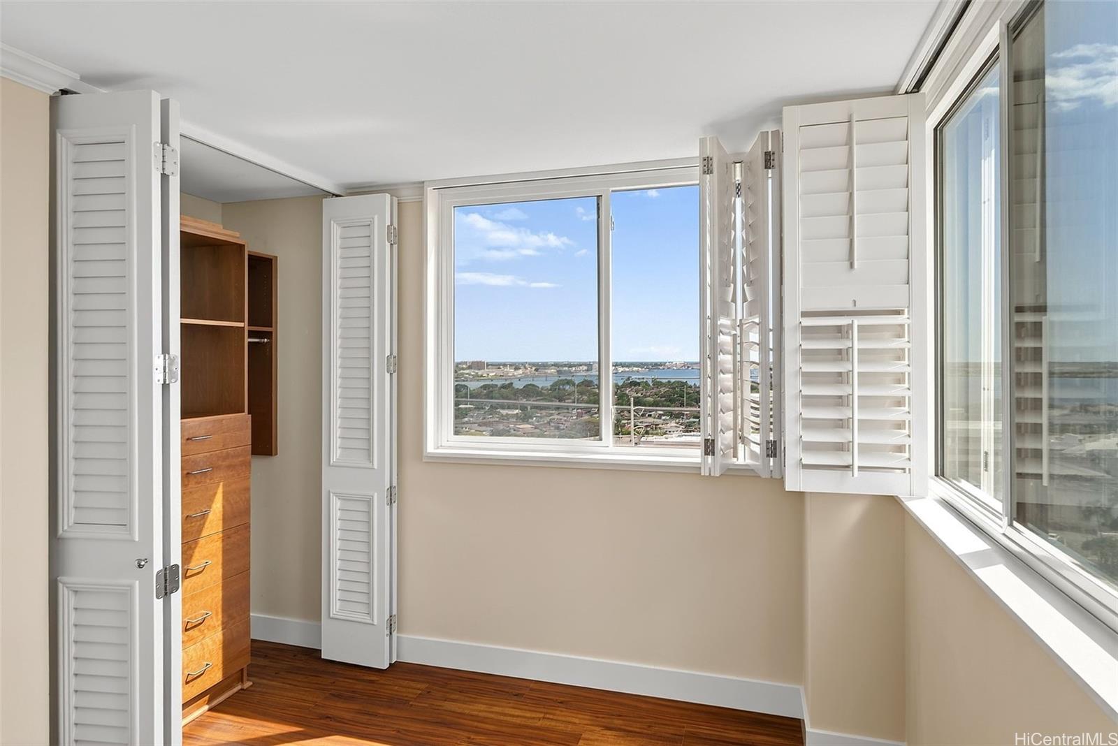 Ocean views from this beautifully updated 2-bed, 2-bath, 1-parking residence at Park at Pearlridge. Experience elevated island living in this high-floor home showcases wide-ranging views spanning the ocean, mountains, and city skyline, enjoyed from the comfort of your private lanai. The open layout is enhanced by rich Koa-style vinyl plank flooring and thoughtful modern finishes throughout. The kitchen features premium appliances—including Bosch cooktop, microwave hood, dishwasher, and a Sub-Zero refrigerator—paired with elegant marble countertops. Additional upgrades include a Miele washer/dryer, custom California Closets, and motorized Hunter Douglas shades for effortless comfort.
