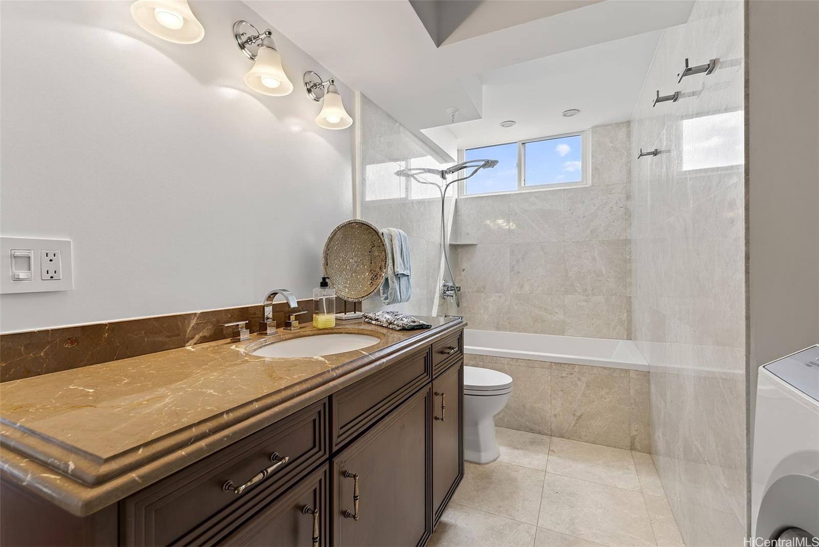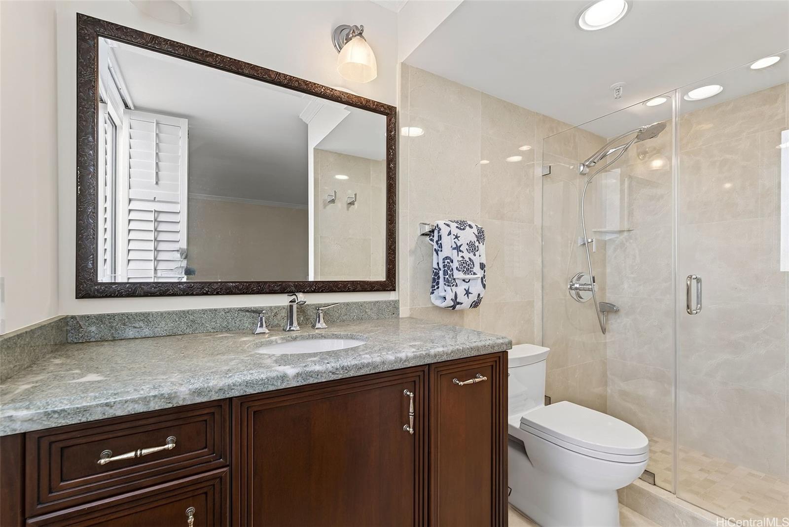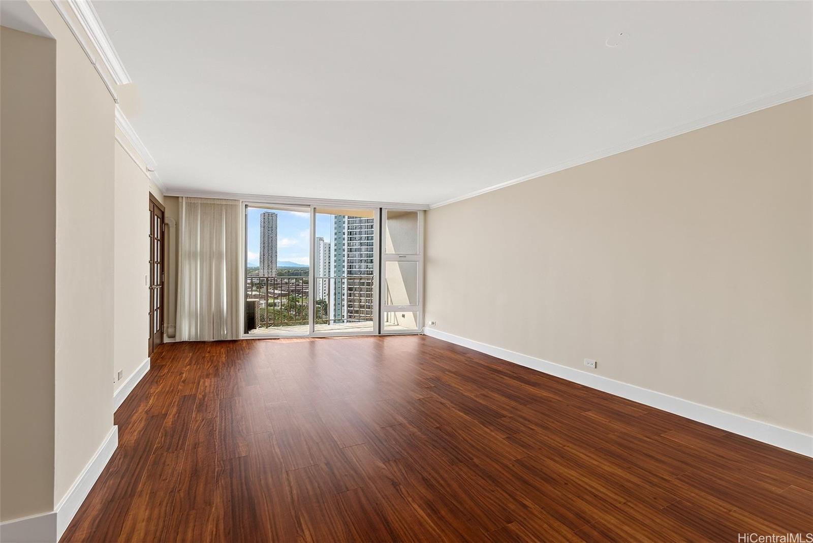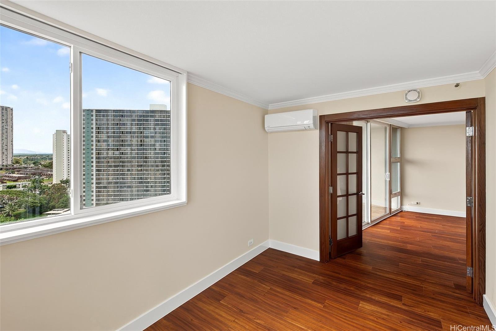 Ocean views from this beautifully updated 2-bed, 2-bath, 1-parking residence at Park at Pearlridge. Experience elevated island living in this high-floor home showcases wide-ranging views spanning the ocean, mountains, and city skyline, enjoyed from the comfort of your private lanai. The open layout is enhanced by rich Koa-style vinyl plank flooring and thoughtful modern finishes throughout. The kitchen features premium appliances—including Bosch cooktop, microwave hood, dishwasher, and a Sub-Zero refrigerator—paired with elegant marble countertops. Additional upgrades include a Miele washer/dryer, custom California Closets, and motorized Hunter Douglas shades for effortless comfort.