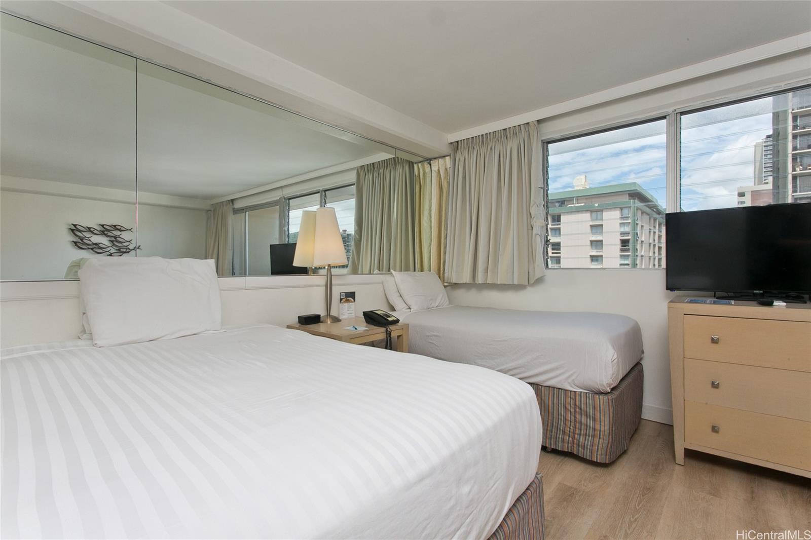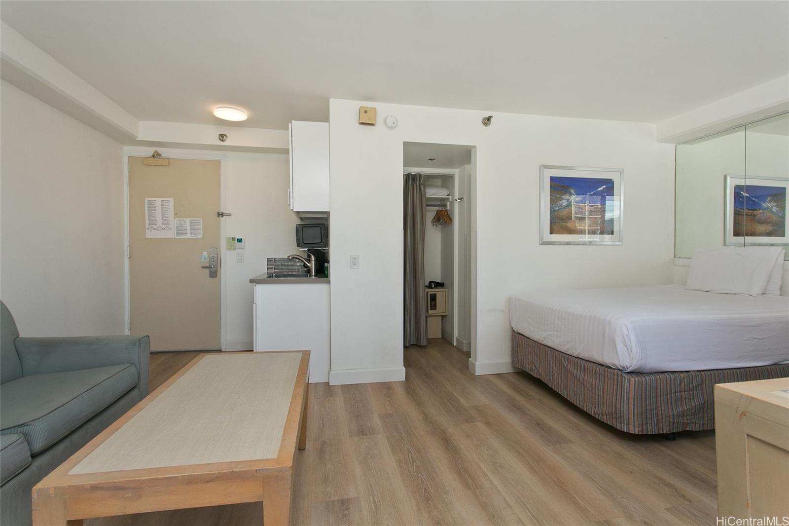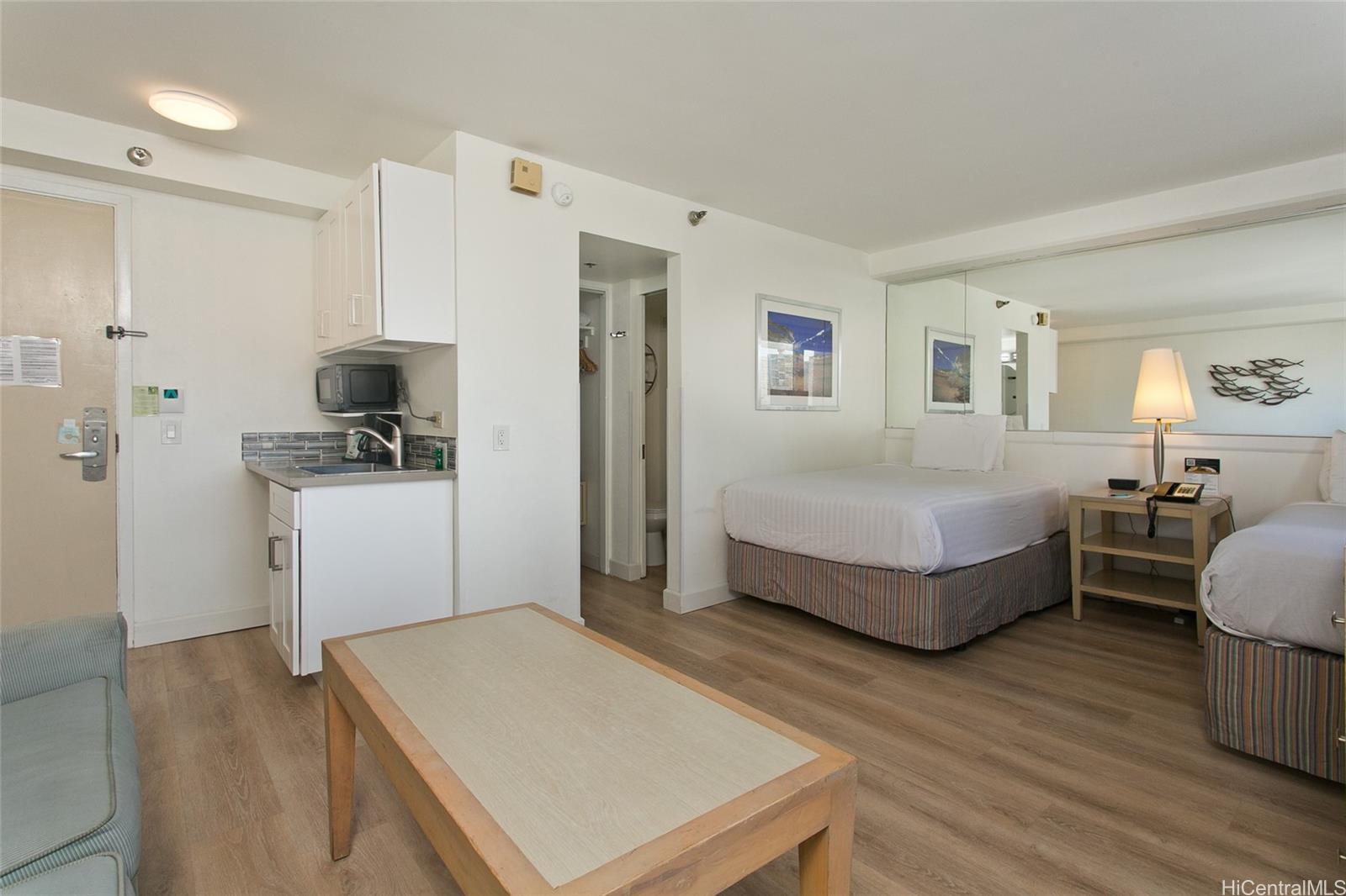 ワイキキのコンドミニアムで立地を最優先事項とするなら、ワイキキの中心部に理想的な場所に位置するアロハ サーフ ワイキキは優れた選択肢として際立っています。ビーチからすぐの距離にあるため、毎日海を楽しみたい方に最適です。ショッピング好きの方には、近くのロイヤル ハワイアン ショッピング センターで幅広い小売店をご利用いただけ、グルメ好きの方には、近隣に多様なレストランが揃っています。ホテル コンドミニアムを所有することで、滞在費を抑えられるだけでなく、ユニットを使用していないときに賃貸収入を得る機会も得られるため、魅力的で柔軟な投資オプションとなります。2025 年 12 月に全面改装されたこのユニットは、新しい LVP フローリング、幅木、シャワー タイル、洗面化粧台、シンク、簡易キッチン、バスルーム設備、トイレ、塗装、照明で完全にリフレッシュされ、ポップコーン天井も撤去され、全体的に清潔でモダンな美観が実現されています。