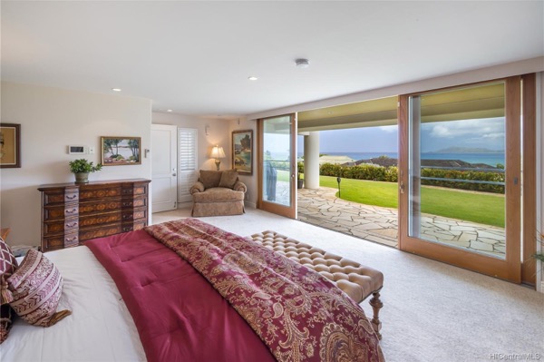 窓の外には、アウトドアリビングのあるパティオの続きがあり、ベッドの中にいながら庭越しに素晴らしいオーシャンビューを楽しめる贅沢さ。