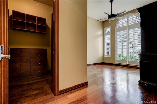 玄関脇の廊下の先にあるセカンドベッドルームは写真のようにオフィス仕様の作り付け家具がありますが、