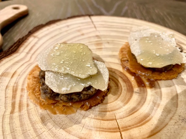 バターで炒めたマッシュルームをパイ生地の上にのせ、さらに削ったトリュフがトッピングされています。バターの濃厚な香りとトリュフの芳醇な香りがあわさり、まさに香りを楽しむ一品です。
