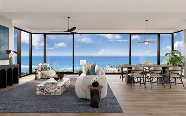 ユニット内の様子もご紹介していこう。こちらは3ベッドルームのコーナーユニットのリビンク。ダイヤモンドヘッドから長く広がる水平線が楽しめるオーシャンビューは、遮るもののないこの立地ならではの特権。