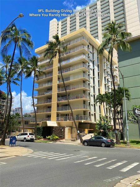 ワイキキの中心部にある「コーラルテラスアパート」。10階建ての建物には、全て2ベッドルームの住戸が36戸入っています。