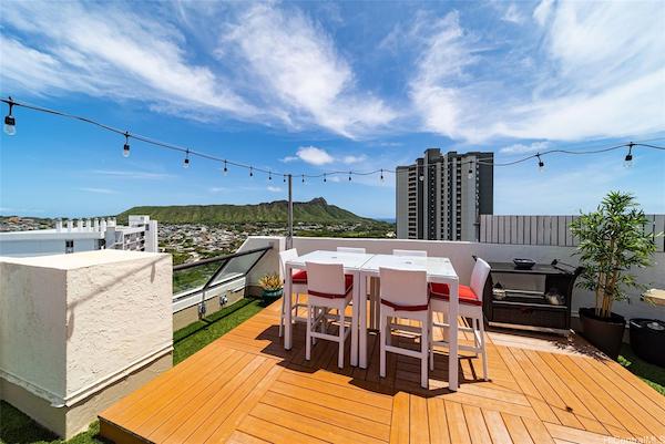 ダイヤモンドヘッドがや海、街のビューを楽しめる、屋上デッキがついた綺麗なペントハウス物件でゆったりとしたハワイ時間をお楽しみください。
