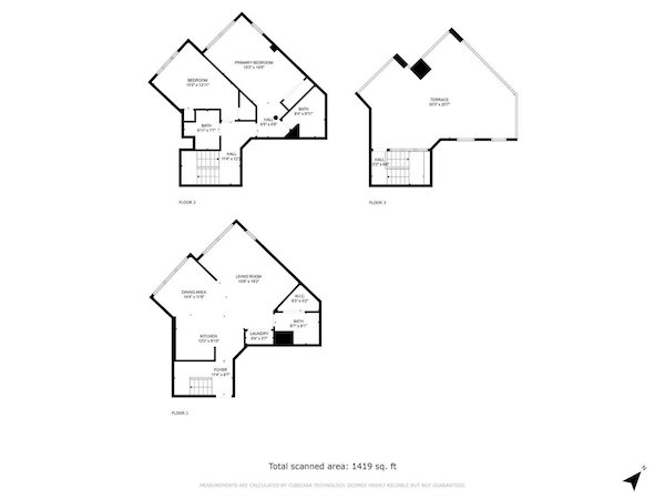 ペントハウスの間取りは下図の通り。3層のペントハウスになっており、居住面積は下の2層。一番下がリビング・ダイング・キッチンと、洗濯機・乾燥機の入ったランドリーキャビネット、トイレと洗面台のみのバスルーム、そしてウォークインクロゼットになっており、中層階に2つのベッドルームと2つのフルバスルームがあります。そして最上階が屋上テラス。