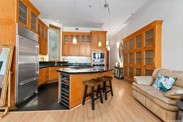この住戸は、これまでずっと一人のオーナーが所有しており、室内はおよそ4万ドルをかけてアップグレードされています。リビングの隣にあるキッチンはアイランド型。キッチンには高級家電メーカーののウルフ社もしくはサブゼロ社が設置してあります。