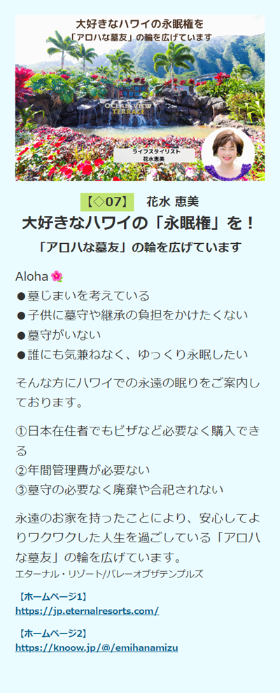 ハワイのお墓、また終活などにご興味のある方は、ハワイ在住のライフスタイリスト花水恵美さんまでお問い合わせください。*花水恵美さんへ直接お問い合わせ頂いた方のみ、日本語での対応と購入の際のスペシャルディスカウント(適用外もあります)が適用されます。