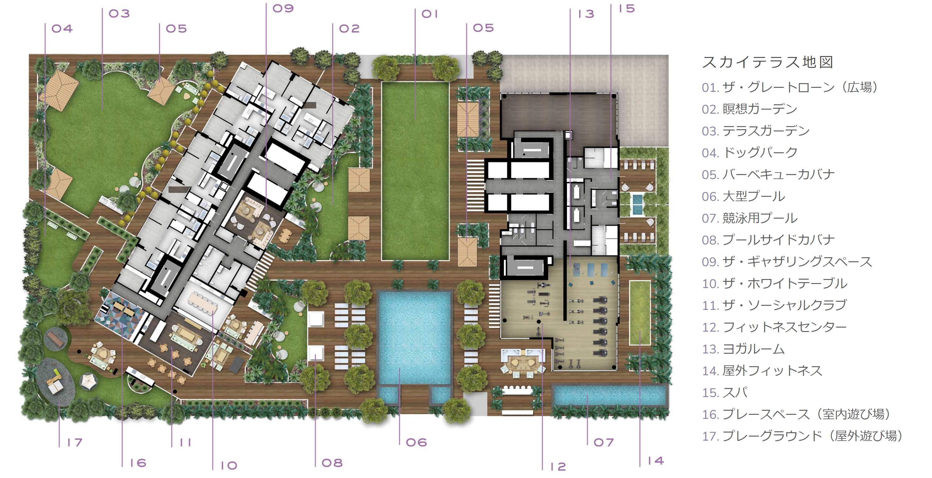 アメニティフロアは「スカイテラス」と言われホノルル最大級の広さ。大型のプールやBBQカバナ、バーカウンター、フィットネスセンター、ヨガルームなどがずらりと揃います。