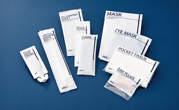 アメニティはANAオリジナルの歯ブラシ、耳栓、アロマカード、マスクなどを、CAが巡回して配布するスタイル。スリッパはタオル地のふわふわ素材。