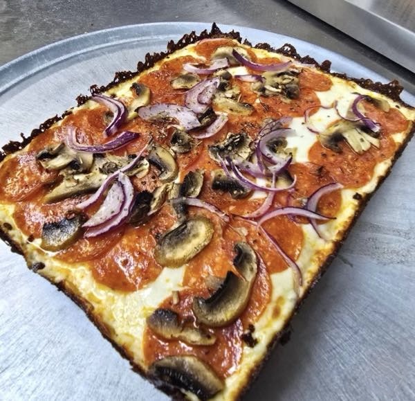 デトロイトスタイルピザは厚めのスクエア生地、香ばしいチーズのエッジが特徴で、チーズ、ホワイトガーリック、ペパロニ、ベジタブルなどから選べる。