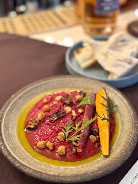 ハッピーアワーは14:00〜18:00(バーカウンターのみ)で、生ビールが$6、ハウスワインやサングリア、一部カクテルが$8に、また、フードメニューも$10〜$15とお手頃価格で提供される。鶏のレバームース、ナスとポテトのグラタン、生ハムと白桃のコンポート、自家製フムス、さらにハーフサイズのピンサロマーナなど、お酒に合うメニューが勢揃い。ワイキキで軽く一杯飲みたい時にもぴったりのお店だ。