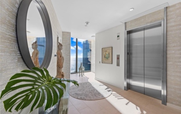 このワイエアの3400号室をスペシャルなものにしている理由の一つが、このユニット専用のフォブ(電子キー)付きのエレベーターでアクセスできることです。ユニットの玄関前には他の人がアクセスできないプライベートホワイエがあるため、プライバシー面、セキュリティ面でも万全です。