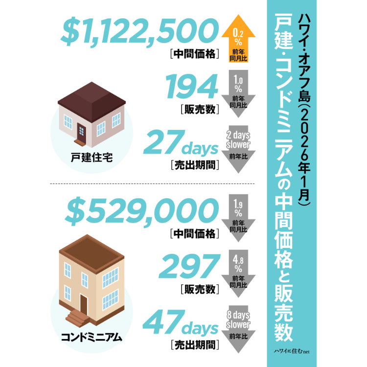 2026年1月のオアフ島不動産市場は、一戸建てが引き続き底堅さを保つ一方で、コンドミニアムは在庫増加と販売期間の長期化が進行し、市場の温度差がより明確になった。