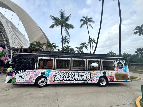 ハワイは前日まで雨模様だったが、この日は晴れ間も見える上々の天気でまさにライブ日和。 本公演はホノルルフェスティバルのシスターイベントとして開催され、街中にはフラッグやラッピングバス(上写真3枚目)も登場。ハワイと日本の文化交流を象徴するイベントとして、開催前から注目を集めていた。