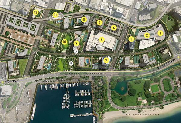 ①サウスショアマーケット②ワードビレッジ・ショップス③アナハ(コンドミニアム)④ホールフーズ⑤アエオ(コンドミニアム)⑥ワードエンターテインメントセンター⑦ワイエア(コンドミニアム)⑧アアリイ(コンドミニアム・建設中)⑨コウラ(コンドミニアム・建設中)⑩ビクトリア・ワード・パーク(建設中)⑪カカアコレールステーション(建設予定)⑫ケ・キロハナ(コンドミニアム)