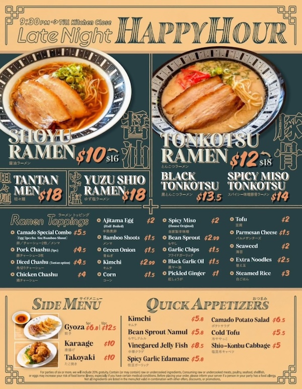 ■ 「CAMADO Ramen Tavern」でレイトナイトハッピーアワーが新登場