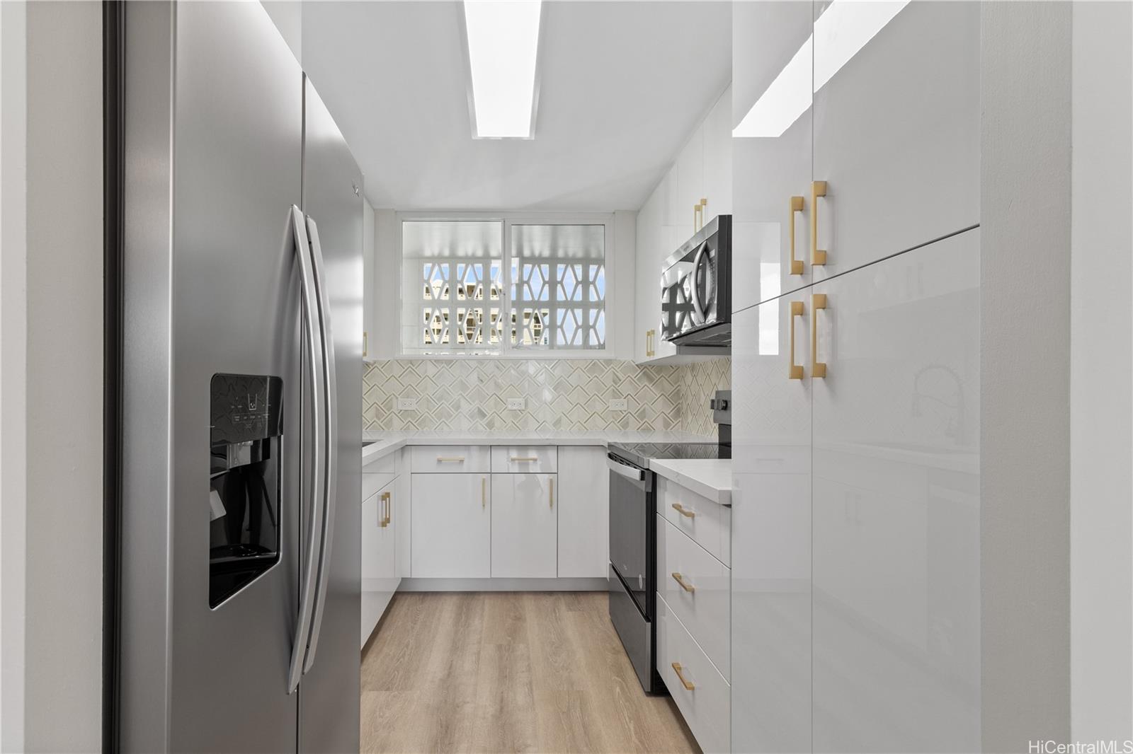 人気のワイプナ地区にある、オーシャンビューとダイヤモンドヘッドビューが自慢の、全面改装済みの2ベッドルーム、2バスルームのレジデンスで、ワイキキの最高の暮らしをご体験ください。細部にまでこだわった、隅々までこだわったリノベーションです。全室にスプリットエアコンを完備。広々としたメインスイートは、ダブルシンクの洗面台、ベンチシート付きの大型シャワー、アップグレードされたシャワーシステム、そして豊富な収納力を備えた広々としたクローゼットが魅力です。全面改装されたキッチンは、洗練された高光沢アクリルキャビネット、同クラスの物件では滅多に見られない優れた収納力、マルチドロワーパントリー、回転式キャビネット、そして引き出し式コーナーキャビネットシステムを備えています。ステンレス製の家電製品とモダンなレイアウトが、清潔で無駄のない調理体験を実現します。その他のアップグレードには、新品の洗濯機/乾燥機、デザイナー照明、新しいビニール製スライド窓などが含まれます。このワイプナ地区で唯一無二の住宅は、モダンで思慮深く改装され、すぐにでも入居可能な希少な物件です。見逃せないチャンスです!
