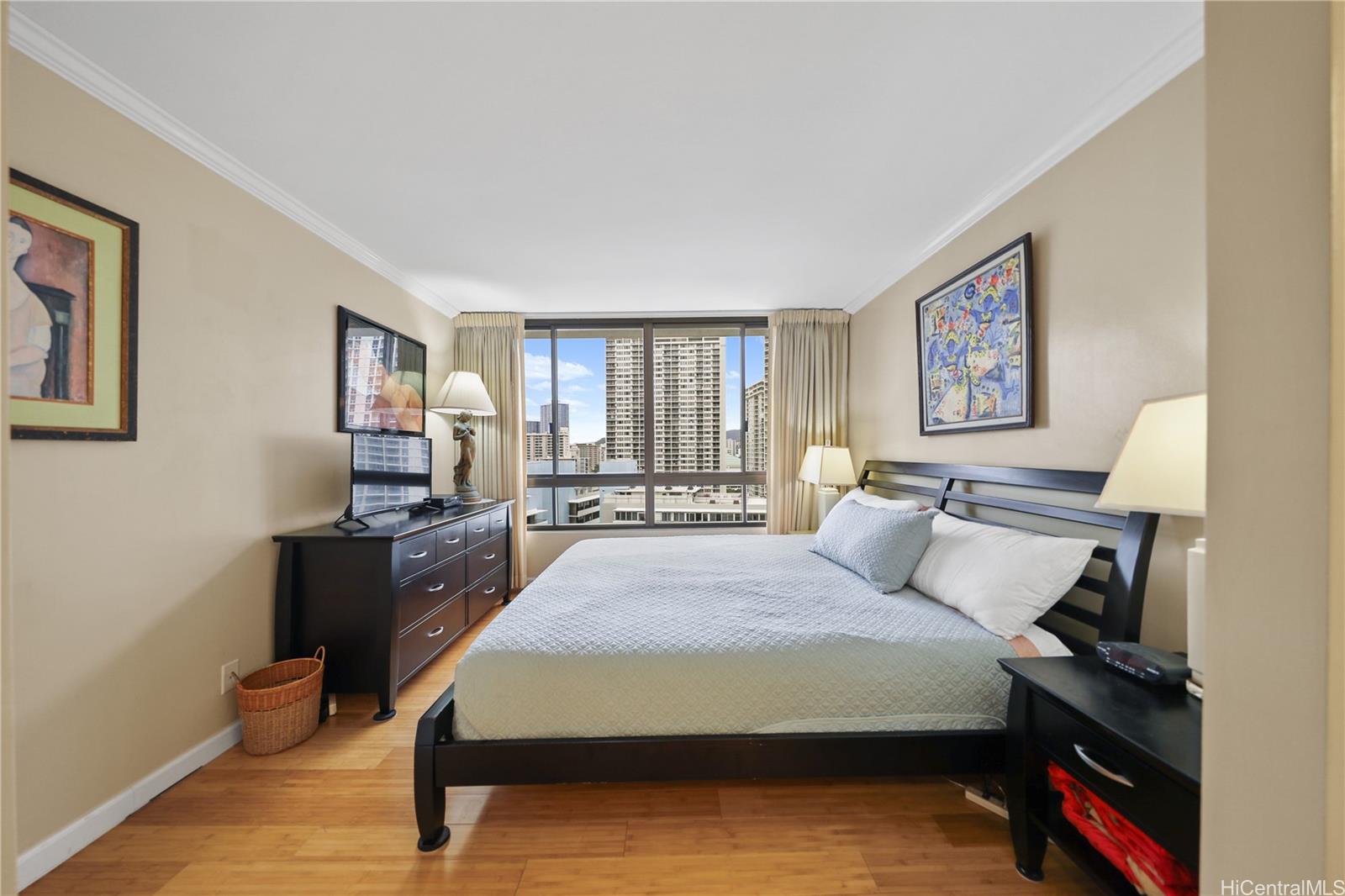 Stop compromising. Residence 18A at Canterbury Place is the Waikiki unicorn you have been waiting for, featuring 2 rare covered parking stalls and a pet-friendly policy with NO weight limit. This is not just a condo; it is a house in the sky. The floor plan has been masterfully opened up to maximize flow, showcasing rich bamboo hardwood flooring, custom crown molding, and a modern, bright kitchen. Perfect elevation offers a warm, intimate connection to the lush greenery of DeRussy Park, Diamond Head, sparkling ocean glimpses, and an unbeatable view of the Friday Night Fireworks from your spacious, covered lanai. Smart buyers will love the all-inclusive maintenance fee covering Central AC, Electricity, Cable, Internet, and Water. Enjoy resort-style amenities including a heated pool, jacuzzi, sauna, BBQ and party room, and pickleball court. Perfectly positioned at the gateway to Waikiki, you are steps from luxury dining, famous shopping centers, lively entertainment and world renowned sandy beach parks. Fee Simple and furnishings are negotiable which can make this turn-key ready. This is the perfect balance of luxury, utility, and location. BONUS: building allows 30 days min. rental.
