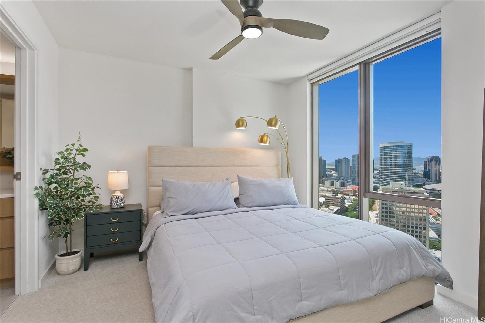 Sky Ala Moana is one of Honolulu's new two tower developments, and it's the first of its kind in Hawaii with one tower having a world renowned Renaissance Marriott Hotel and the other tower the Sky Ala Moana Residences. The synergy this provides is unparalleled with the opportunity to enjoy resort like amenities while having the comfort of your two bedroom, two bathroom condo. This high floor unit features 2 custom walk-in closets, large entry storage closet, Silestone quartz countertops, Bosch appliances, full size wash/dryer, split AC in each room, ceiling fans, floor to ceiling glass in all rooms, 96 square foot open air lanai which allows for breathtaking views of the city, ocean, mountains and sunsets. The convenience of two side by side, gated parking stalls plus storage. The 8th floor amenity deck is one of the largest in Honolulu. This oasis in the sky consists of two heated salt water pools. One being a 25 meter lap pool and the other is one of Honolulu's largest residential pools. Enjoy the full service Renaissance Marriott pool bar, spa's dry&wet sauna, furo, cold plunge, indoor/outdoor gym, 4 hot tubs, BBQ cabanas, party rooms and kids play areas. & Amazing Location!