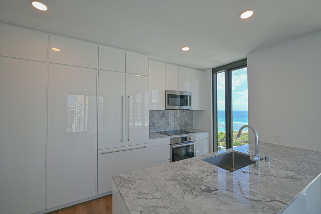 アアリイ高層角部屋へようこそ。この部屋からは、海、夕日、港、山々、街並みのパノラマビューをお楽しみいただけます。室内にはプライベートラナイ、Bosch製家電、高い天井、バックスプラッシュ付き天然石カウンタートップが完備されています。独立した収納室と2台分の専用駐車場(1台はEV充電器付き)もございます。専用駐車場フロアには追加の大容量収納ユニットと天井収納も完備されています。リゾートスタイルのアメニティとして、プール、スパ、BBQグリル、プライベートカバナ、キッズプレイエリア、屋外用子供用プールをご利用いただけます。42階ペントハウス階のアメニティデッキには、フィットネスセンター、ヨガルーム、会議室、ビリヤード台、屋外スカイテラス、広々としたレクリエーションエリアがあります。海やショッピングモールに近い活気ある高級コミュニティに位置しています。是非お気軽にお問い合わせください。