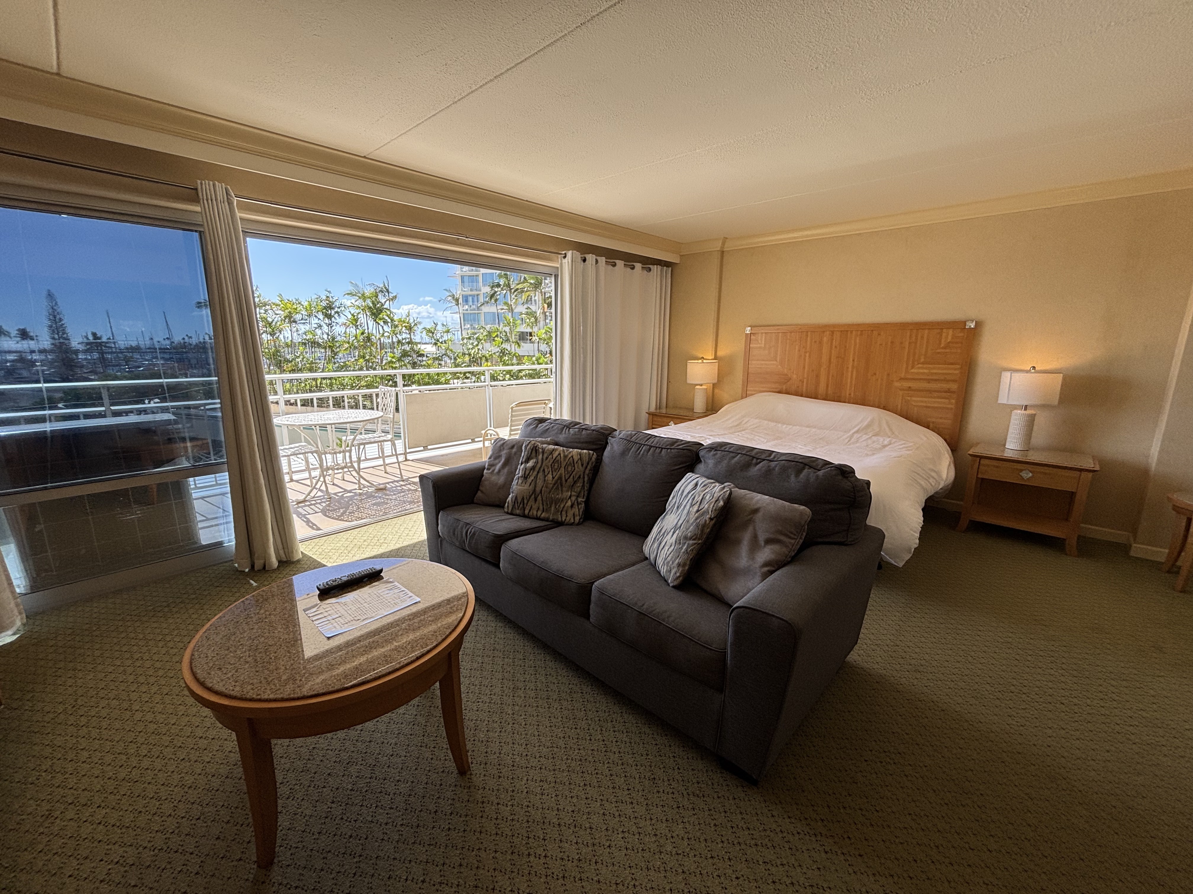 広々としたスタジオタイプ。素晴らしいオーシャン&ハーバービュー。ベッドルーム1室、バスルーム1室、広々としたラナイ付き。