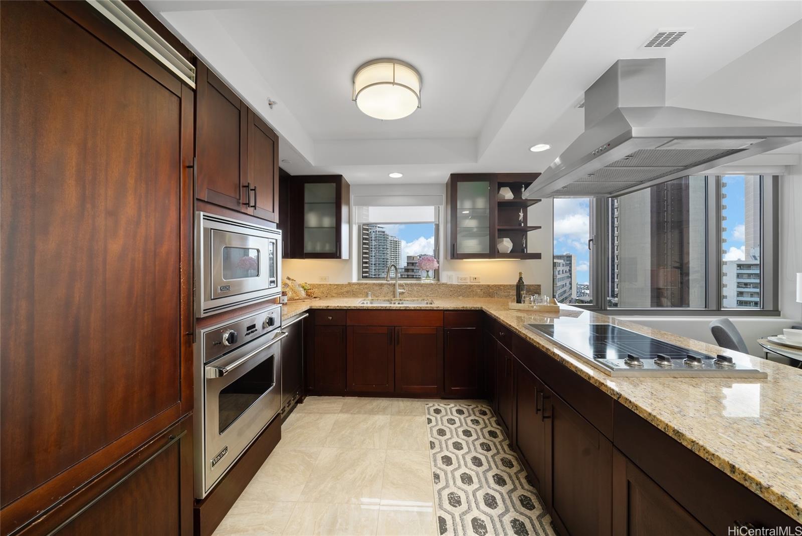 Welcome to The Watermark in Waikiki, where luxury and location blend seamlessly! This corner/end residence boasts breathtaking wraparound views of the ocean, marina, Ala Moana Beach Park, and city. With a spacious living room and extra windows, the unit is filled with natural light, bringing the stunning views right into your home. Fully furnished and move-in ready, this unit is perfect for those looking to settle in immediately or explore rental opportunities. On the ground floor, enjoy resort-style amenities, including lush garden walking and jogging paths, BBQ pavilions, a heated pool, a well-equipped fitness center, and a sauna which are all designed to elevate your lifestyle. Minutes away from the best shopping, dining, and the beaches of Waikiki.