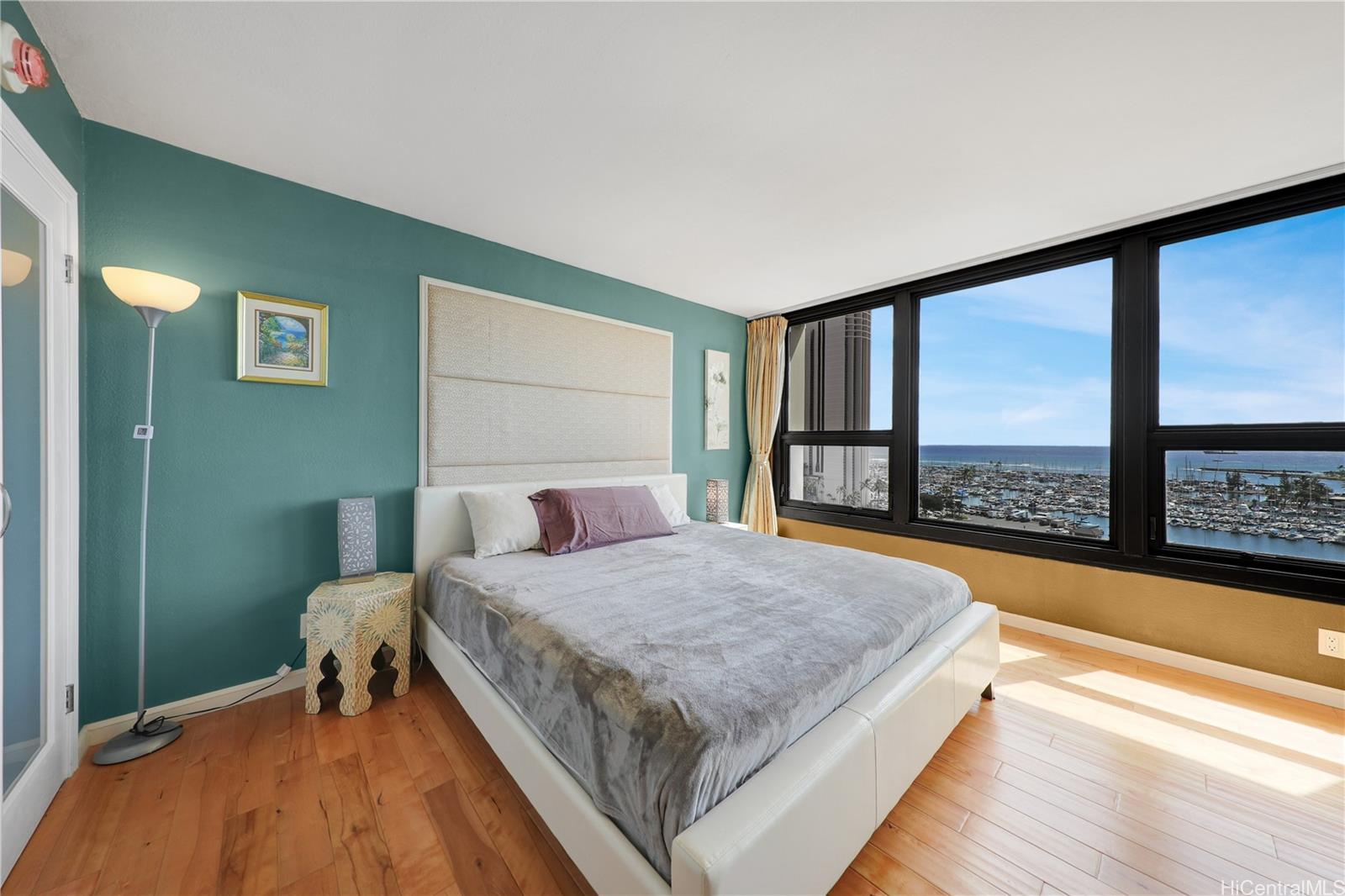 Commandingly set on the ocean side of Yacht Harbor Towers’ Diamond Head Tower, the coveted “01” corner stack frames Magic Island, ocean, coastline, yacht clubs, marinas, beaches, parks, mountains, and sunsets—ever-changing vistas from a true three-exposure residence. Steady trade-wind cross-breezes when you want them; quiet central A/C when you don’t. This exquisitely upgraded 2BR/2BA (~1,495 sq ft interior) orients living and the primary suite toward the blue-water shoreline of Ala Moana Beach Park, Ala Wai Canal and Magic Island, while the second bedroom sits privately apart. Fee Simple. Excellent secure parking stall near the ramp for quick ingress/egress, plus a separate storage locker. The resort-caliber amenity deck features a heated saltwater pool and whirlpool, BBQ pavilions, tennis/pickleball court, an open-air fitness area, recreation/party patio, guest parking, on-site security, and a resident manager. Steps to the sand and beach park paths, with world class shopping and dining next door at Ala Moana Center. At the nexus of coastline, park, and marina—where scale, airflow, and walkability meet—#1501 delivers the premier scenic address at Ala Moana Boulevard.