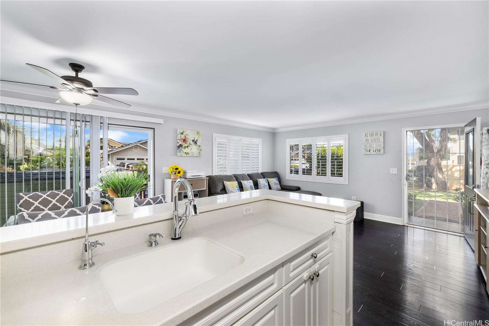 DO NOT MISS THIS OPPORTUNITY TO OWN THIS RARELY AVAILABLE 3 Bedrrom, 2 Full Bath GROUND FLR END UNIT with Own Washer & Dryer Unit & a yard in Ewa Gentry. This gem, - Feels Like a Single-Family! Pet-friendly (2 pets allowed buyer to verify) with pool & playground access. This well -maintained 3-bedroon, 2-bath townhome blends comfort, style, and functionality with thoughtful upgrades throughout, 2 parking stalls w/lots of street parking, private 225 sq. ft. lanai with stamped concrete and extra storage - perfect for entertaining or relaxing, thoughtful upgrades-stainless steel appliances, plantation shutters, crown molding, new washer/dryer & more. Prime location near Holomua Elementary, shopping, dining & freeway. An ideal choice for first-time buyers or anyone seeking a move-in-ready home in highly desirable neighborhood!