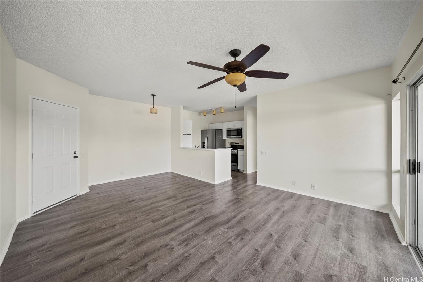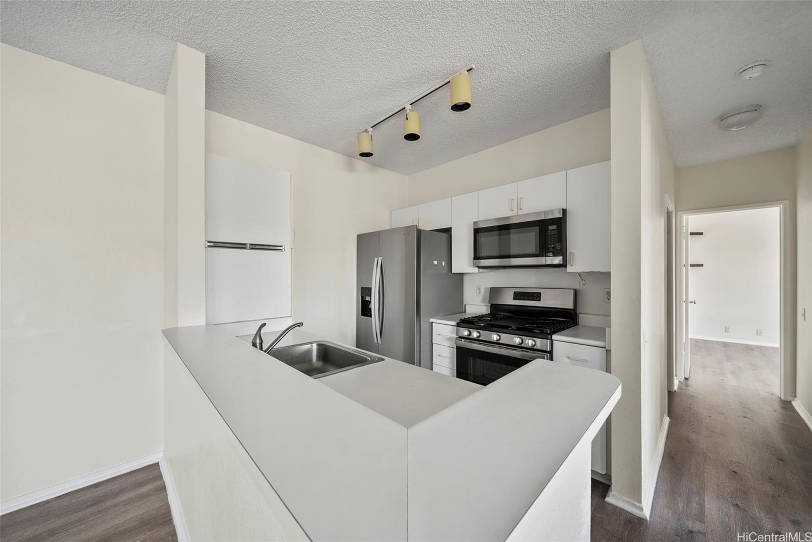 Welcome to Sun Rise in Ewa Beach! This beautifully maintained 2-bedroom, 2-bath condo is located on the third floor, offering extra privacy, improved airflow, and no upstairs neighbors. The open-concept living area is bright and inviting, featuring high ceilings, durable luxury vinyl plank flooring, and access to a private lanai with mountain views—perfect for relaxing after a long day. The kitchen is designed with function in mind, featuring ample cabinet storage, a gas stove, stainless steel refrigerator, built-in microwave, and dishwasher. Both bedrooms are generously sized, with the primary suite offering its own ensuite bath for added privacy. Additional highlights include two parking spaces (one assigned and one carport), in-unit laundry hookups, and well-kept community grounds. Residents of Sun Rise enjoy access to amenities including a pool, BBQ areas, car wash station, and recreation facilities. Centrally located near shopping, dining, schools, and parks, this home combines comfort and convenience in one of O'ahu’s fastest-growing neighborhoods, just minutes from the “Second City” of Kapolei.