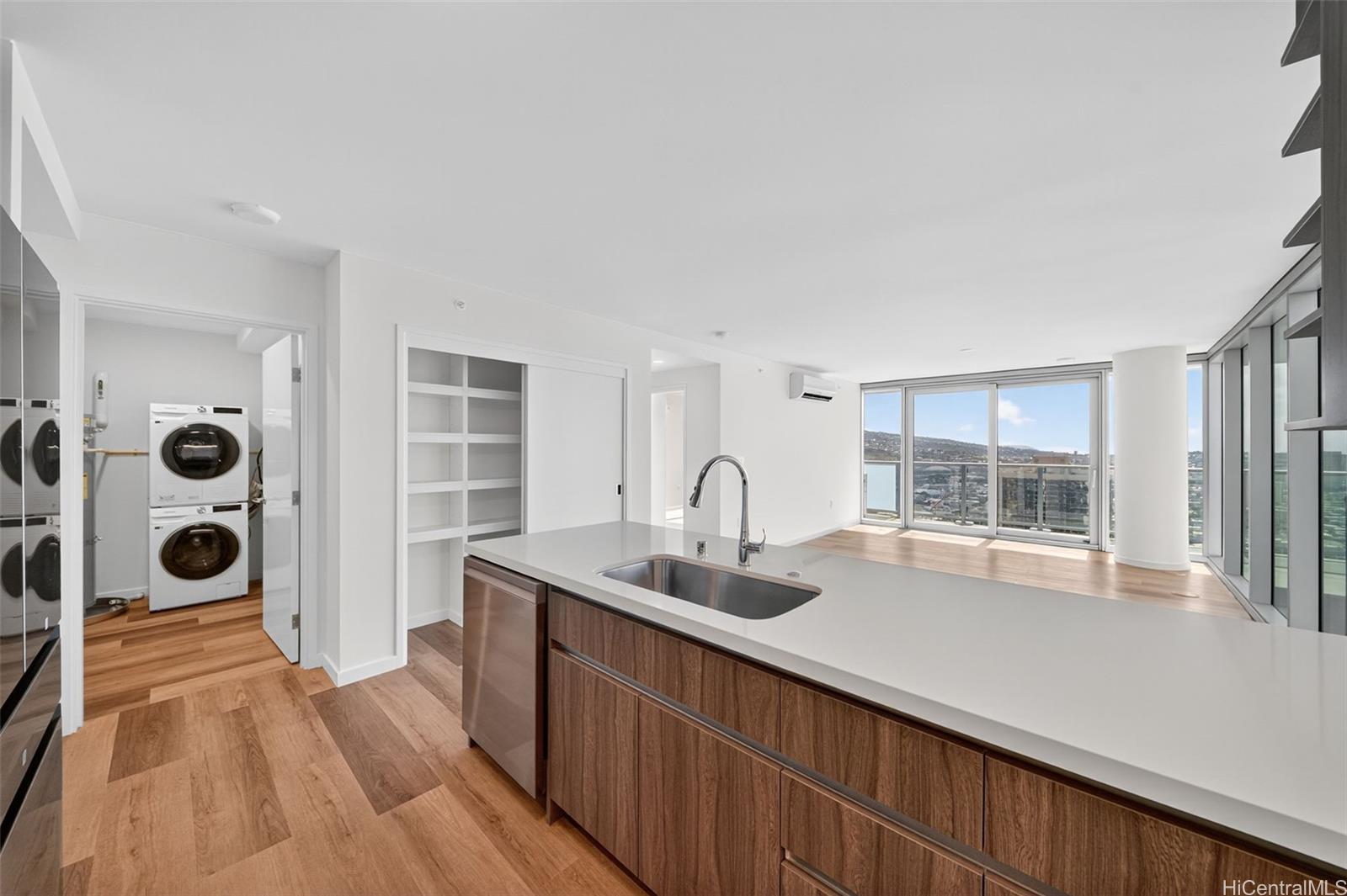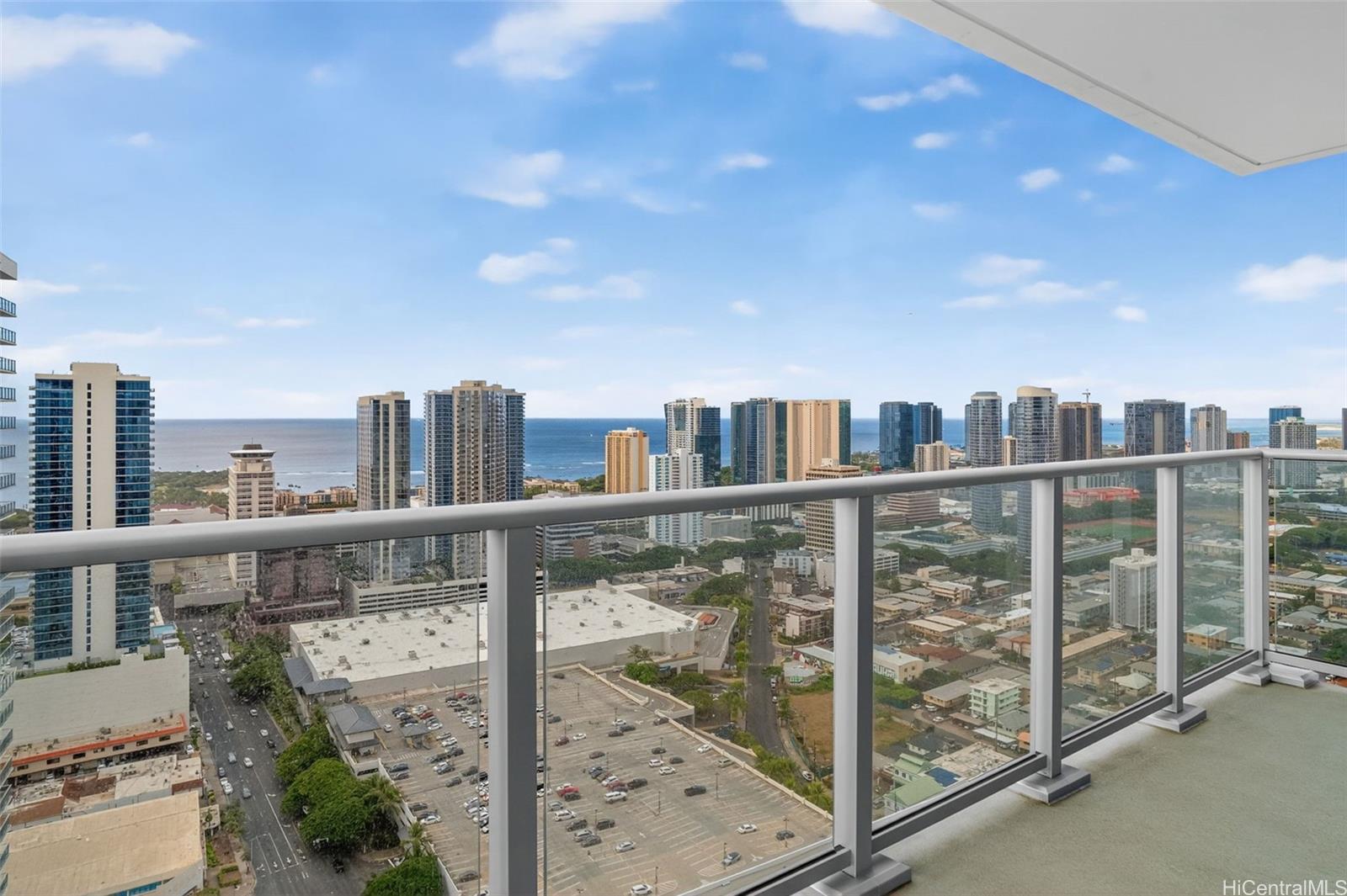This desirable high floor corner residence offers breathtaking ocean and Diamond Head views, with expansive floor-to-ceiling windows that welcome abundant natural light and refreshing island breezes. The home features a spacious living room, open-concept layout, quartz countertops, luxury vinyl plank flooring, split A/C in every room, and a private lanai to enjoy both city and ocean vistas.