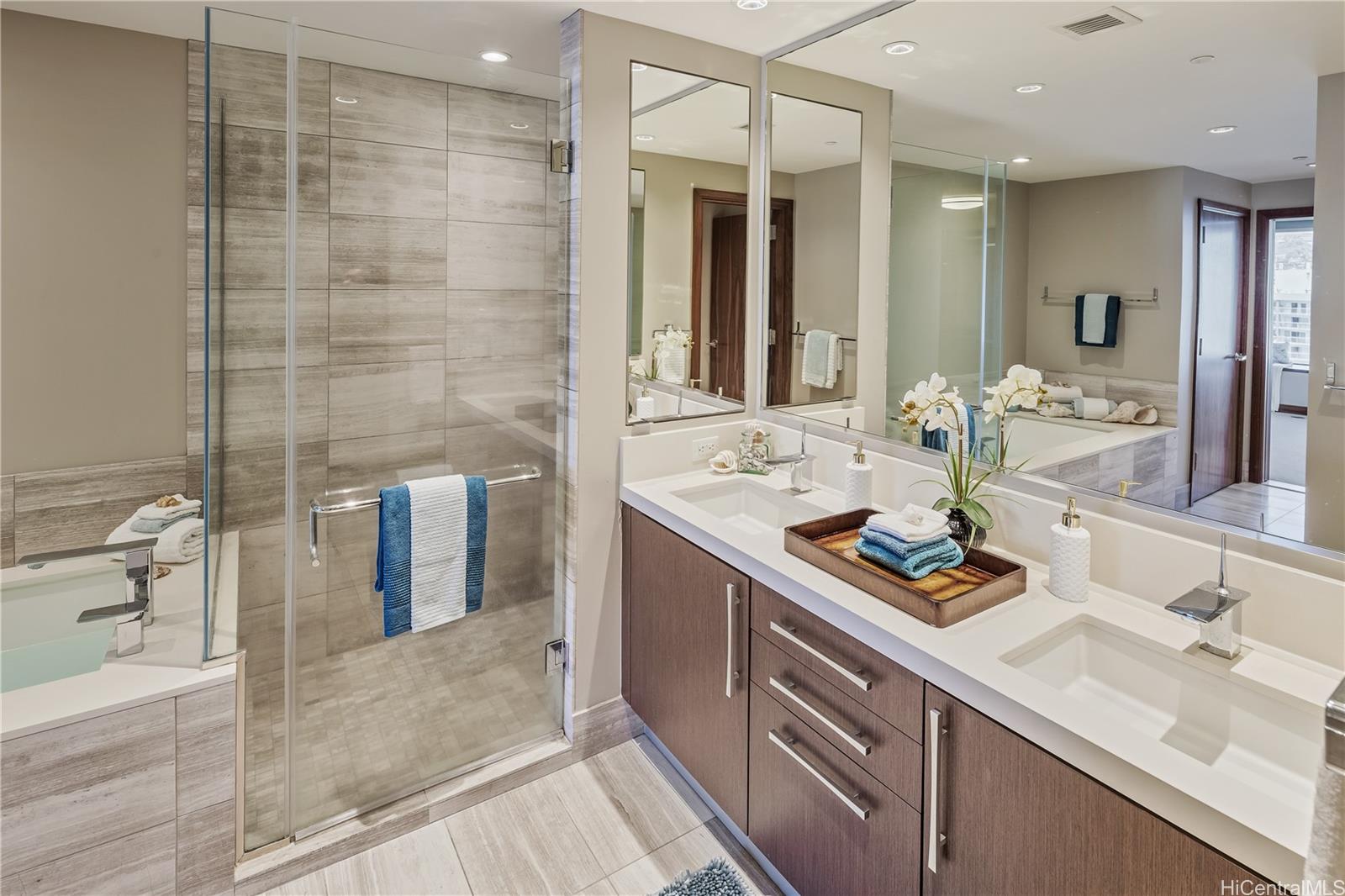 Hardwood floors were refinished just before listing, enjoy cooking with gas, Sub Zero refrigerator and Miele appliances. An open concept design in the kitchen, dining, and living, 2 en-suite bedrooms, guest bedroom, and a guest bathroom. Two side-by-side parking stalls are included, offering direct elevator access to the residence floor without the need to transfer. All furnishings can be included, making the transition effortless for the new owner. The ultimate convenience of daily living with direct access to Ala Moana Center. Shop daily essentials with Foodland Farms, Target, Long’s Drug Store, restaurants from fine dining to food court, and luxury shopping at your finger tips. Resort like amenities include: infinity pool, hot tub, sauna, fitness center, dog park, children’s playground, movie room, private dining, chefs kitchen, guest suites, library, conference room, and more. Secured parking with 24 hour concierge service.
