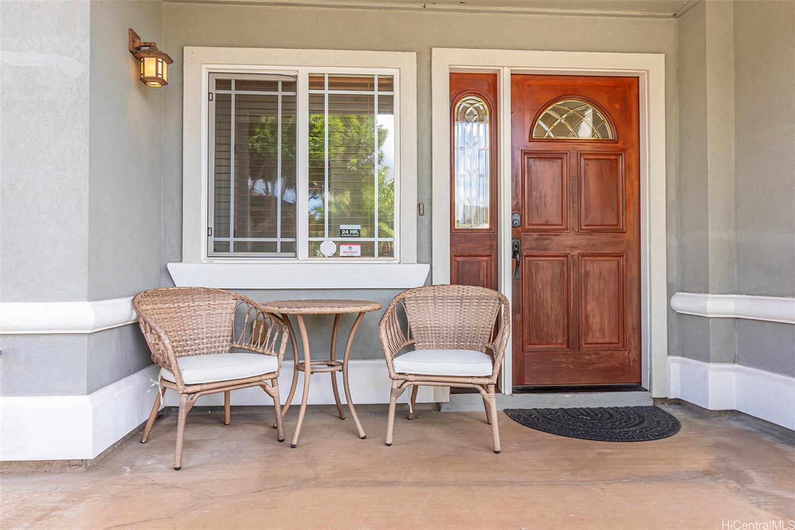 Welcome home to Hoolu Landing at Upper Makakilo! This beautiful corner residence offers 3 bedrooms, 2 full bathrooms, and an attached 2-car enclosed garage. High ceilings throughout create a bright, airy feel, while the fully fenced backyard is perfect for pets, gardening, or entertaining. The spacious eat-in kitchen features cherry cabinets, quartz countertops, and stainless steel appliances. Retreat to the large primary suite with generous closet space and dual vanities. Additional highlights include central A/C to keep you cool, a front-load washer and dryer, and a 27-panel leased PV system (through 2036) for energy savings. The maintenance fee covers water, sewer, and common area upkeep—making this home both comfortable and convenient. Put this one on your must-see list!