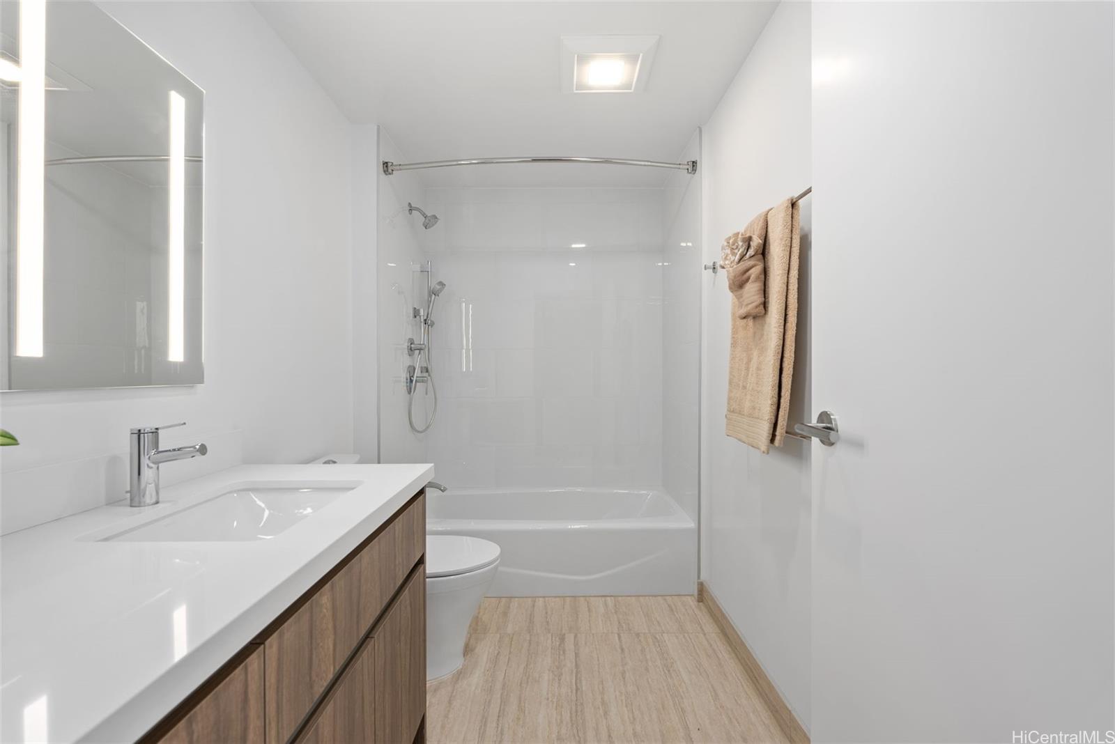 BRAND NEW LISTING!! Liona 3607 at The Park on Keeaumoku offers a stunning one-bedroom residence with a private lanai - Diamond Head view and sunrise, perfect for enjoying Honolulu's urban landscape. This unit features an open-concept living area with luxury vinyl plank flooring and floor-to-ceiling windows that maximize natural light and views. The kitchen is designed with quartz countertops, modern plumbing fixtures, and sleek stainless steel appliances, making it both functional and stylish. The bedroom is a cozy retreat with carpeted floors for comfort, while the bathroom is equipped with quartz countertops, modern fixtures, and LED medicine cabinets. A quiet, energy-efficient split AC system ensures a comfortable climate throughout the home. The building provides resort-style amenities including an infinity pool, spa, movie theater, fitness center with a sauna and yoga room, and private BBQ pavilions. With 24/7 security, secured covered parking, bike storage, and EV charging stations, this pet-friendly unit is an ideal blend of luxury, convenience, and modern living. Don't miss this great Opportunity!!! A few photos have been virtually staged(enhanced).