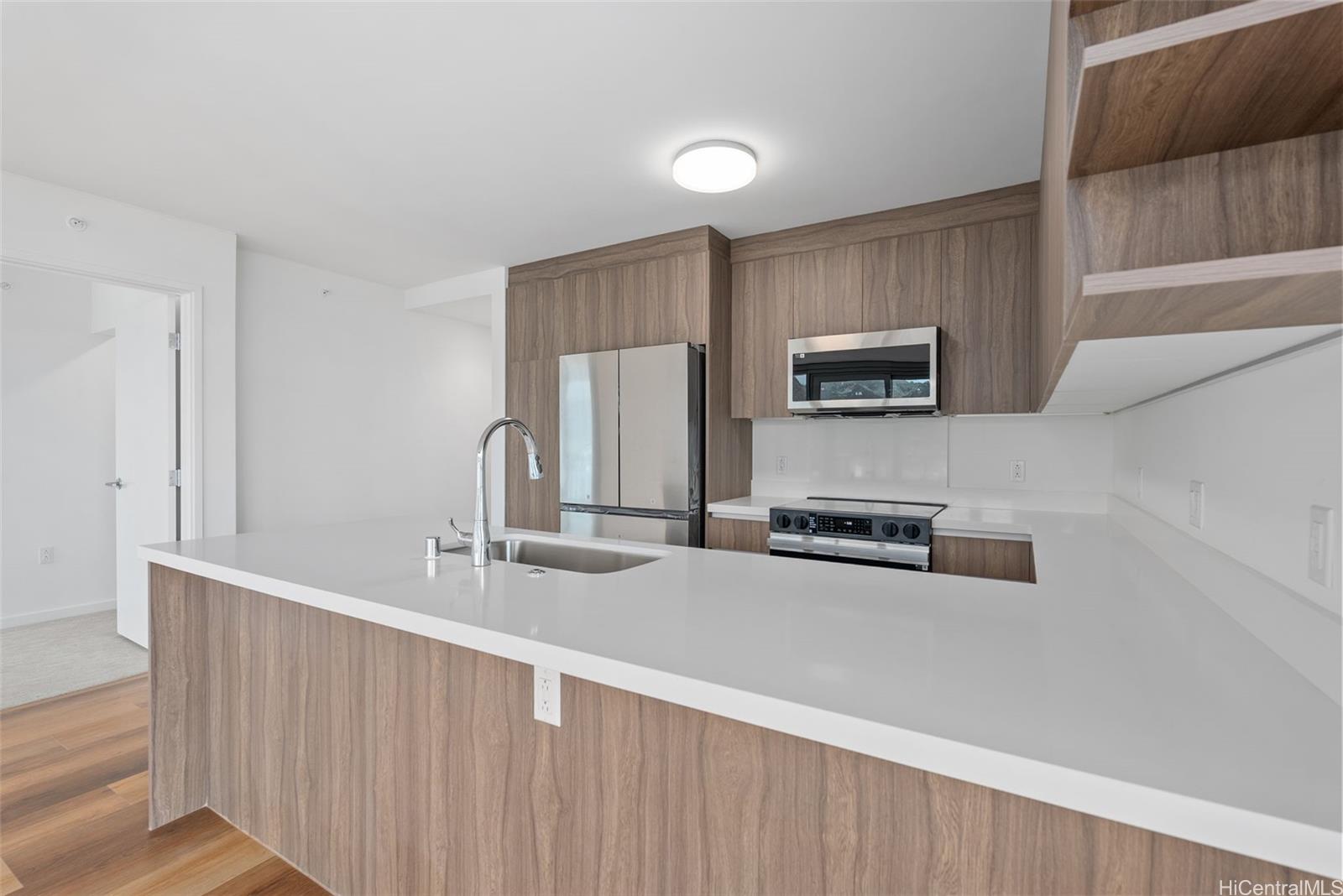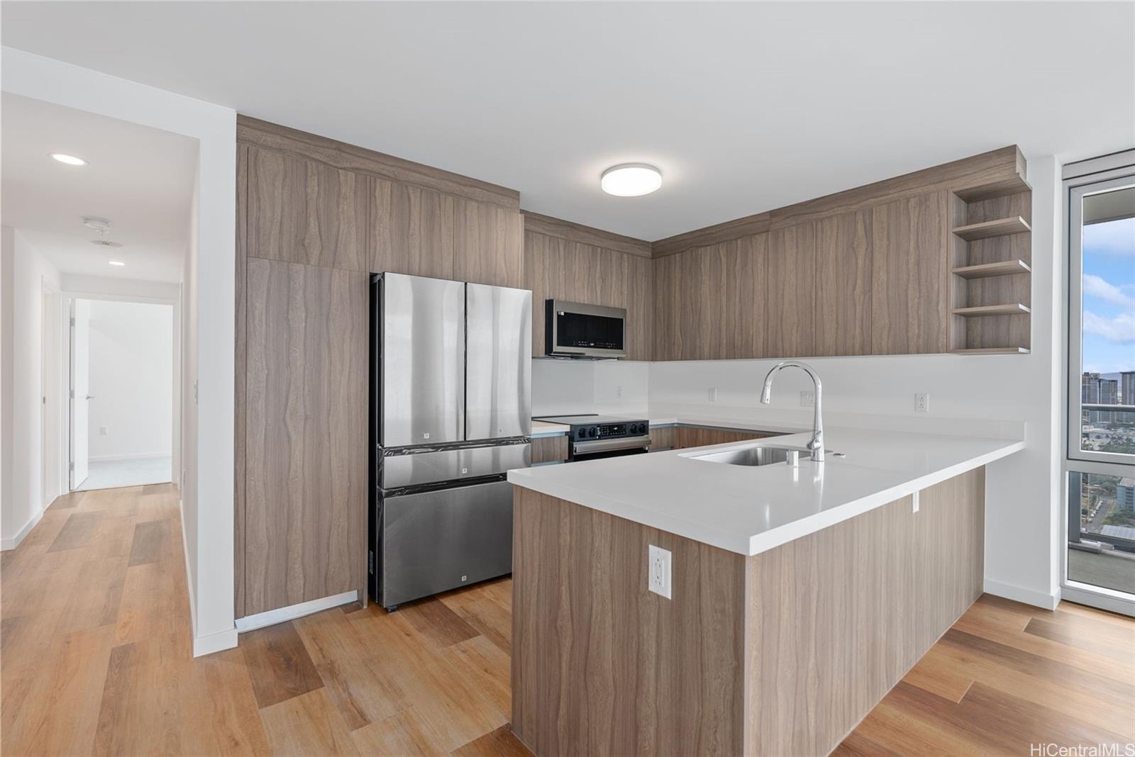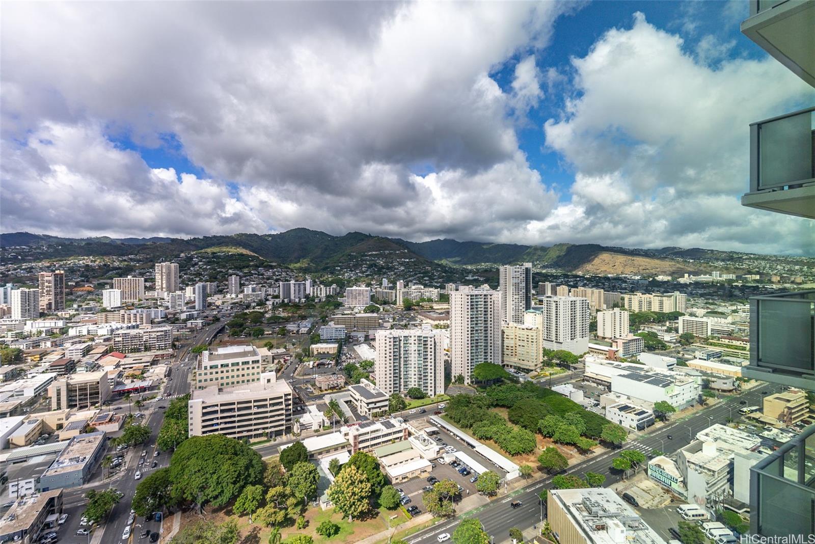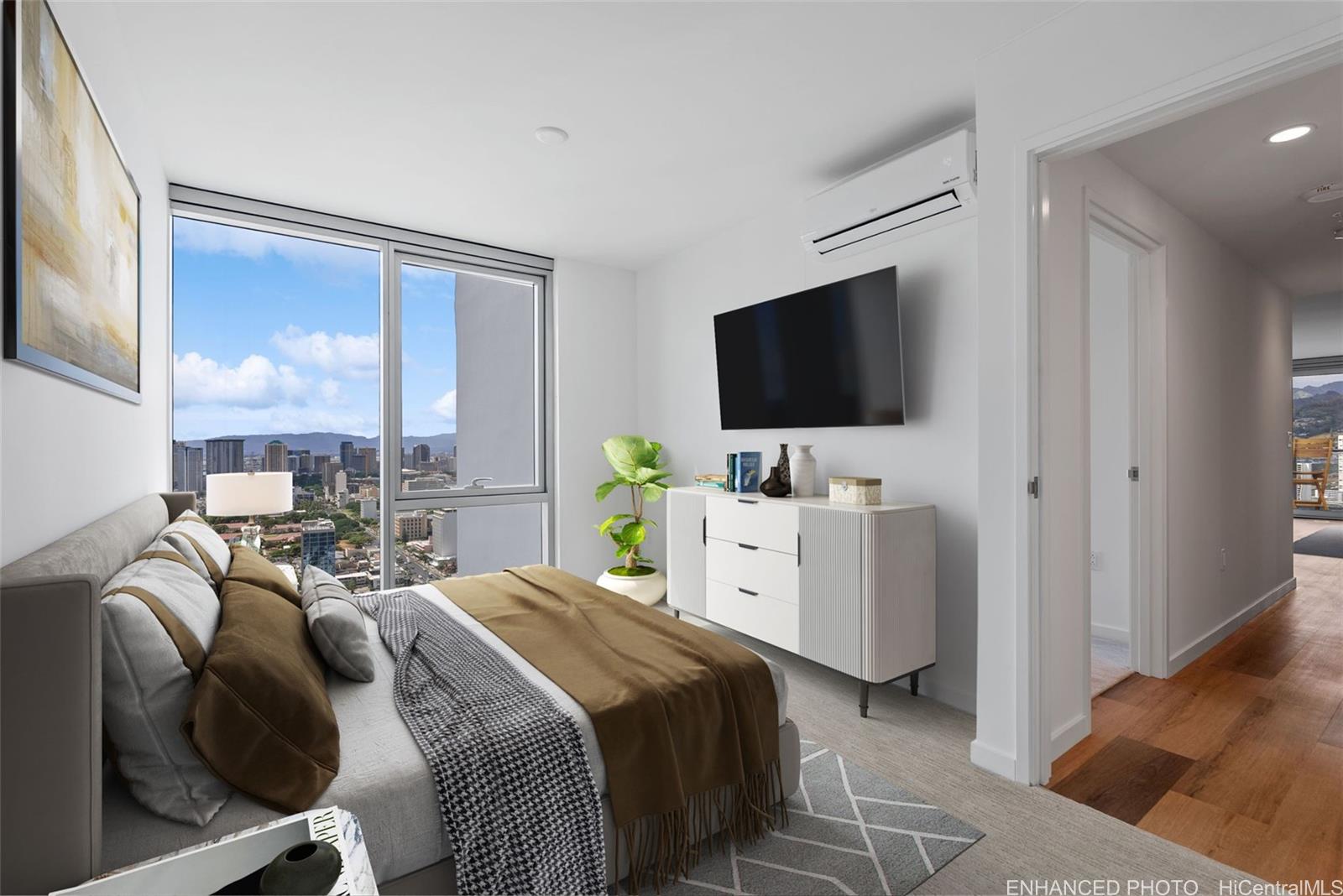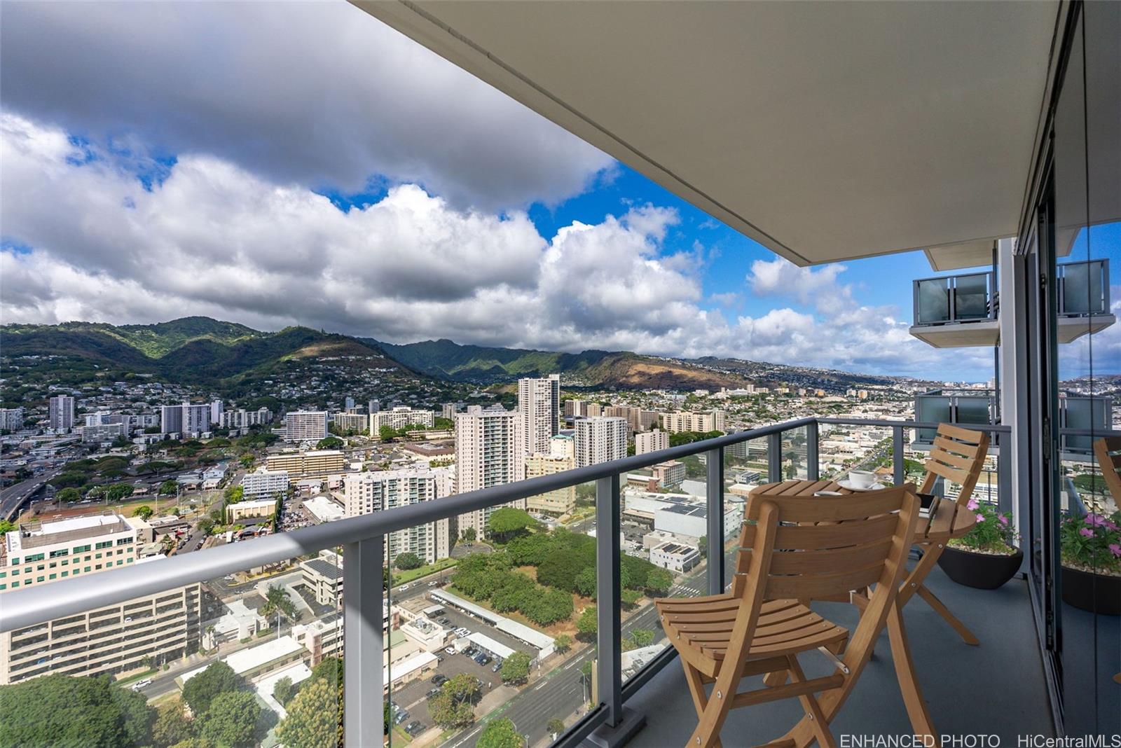 PRICED TO SELL!!! The Park on Keeaumoku’s Liona Tower #3718 is a brand-new 3 bedroom, 2 bath residence with 1,147 sf interior and a rare L-shaped wraparound lanai (186 sf) showcasing 270° views—South Shore Ocean toward Ala Moana, the full Ewa coastline, mountains, sunsets, and even eastward toward UH with a peek of Koko Head. Situated high on the preferred 18 stack, this home is one of only 40 3-bedroom/2-bath units across both Liona and Rycroft Towers, underscoring its rarity and value. The open layout features floor-to-ceiling windows and luxury vinyl plank flooring that maximize light and views. The kitchen offers quartz countertops, stainless steel appliances, and designer fixtures, while bedrooms include plush carpet. Bathrooms are finished with quartz and LED medicine cabinets. A quiet, efficient split AC provides year-round comfort. Pet-friendly and secure, the building offers resort-style amenities: infinity pool, spa, movie theater, fitness center with sauna and yoga room, BBQ pavilions, landscaped decks, 24/7 security, covered parking, bike storage, and EV charging. A few photos have been virtually staged(enhanced).