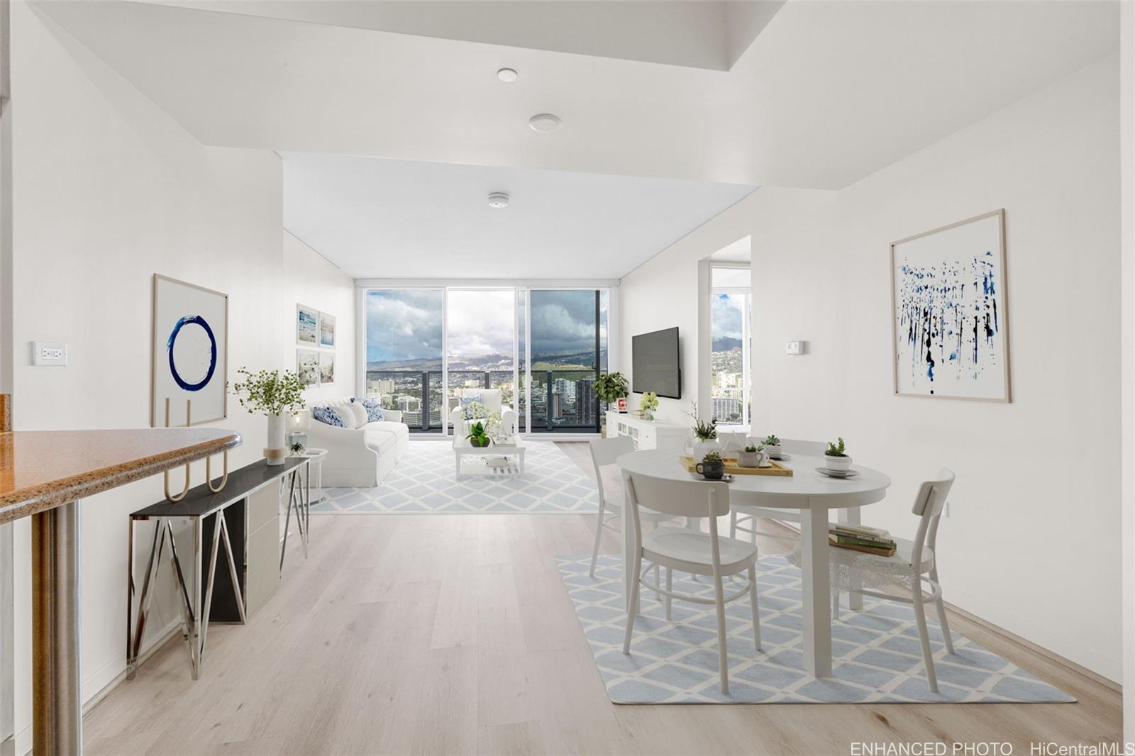 TWO (2) PARKING STALLS near elevator. High 47th Floor Below Penthouse! 2-bedrooms, 2-baths, 2-Parking Stalls on the Desirable Cooler side of the building. NEW Luxury Vinyl Planks Flooring, New Water Heater installed 12/8/22, Refrigerator, Electric Range, Dishwasher installed 3/2/20. Amenities include 24/7 Live Security, 2-Tennis/Pickleball courts, Golf putting green and driving cages,