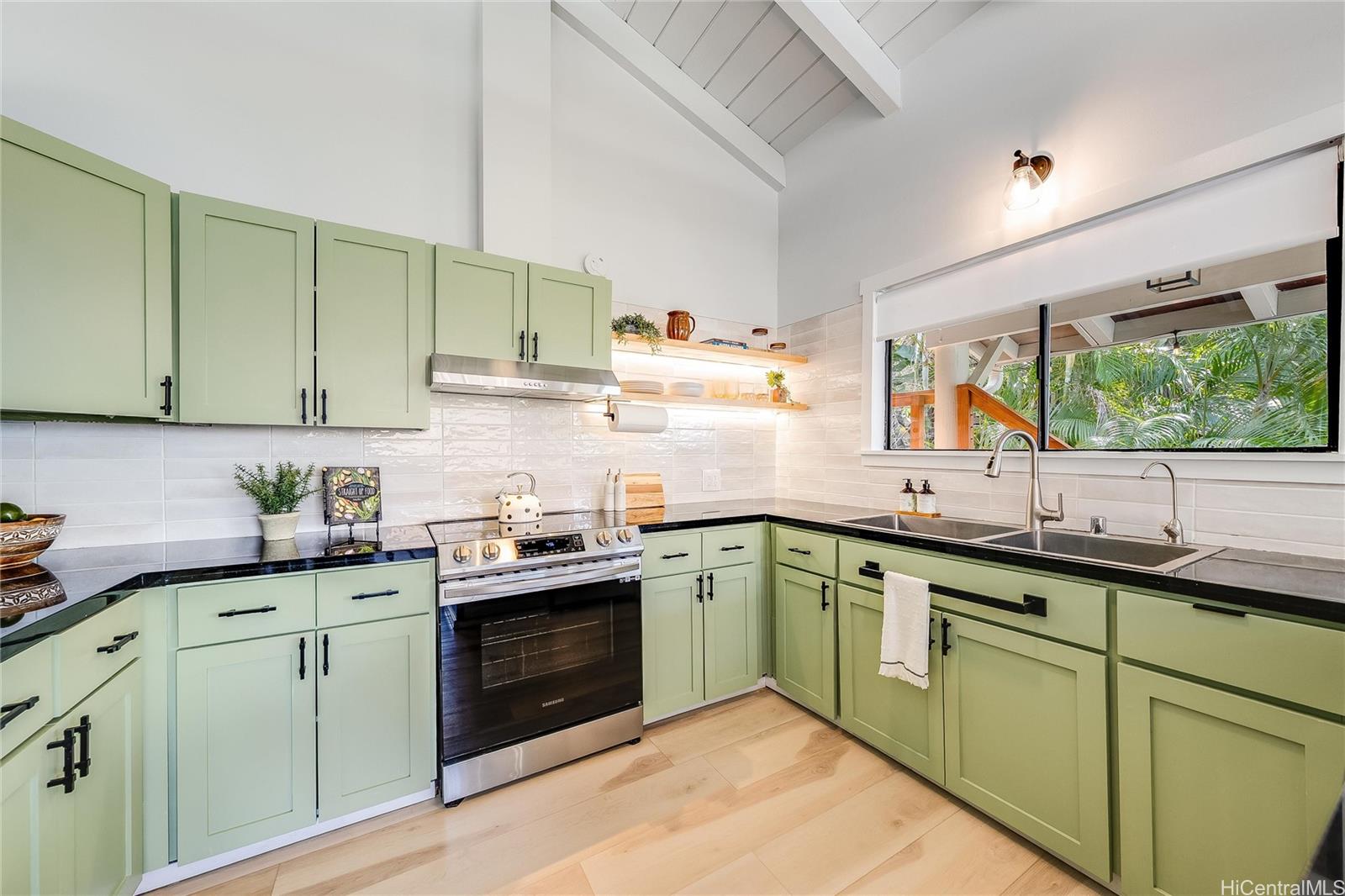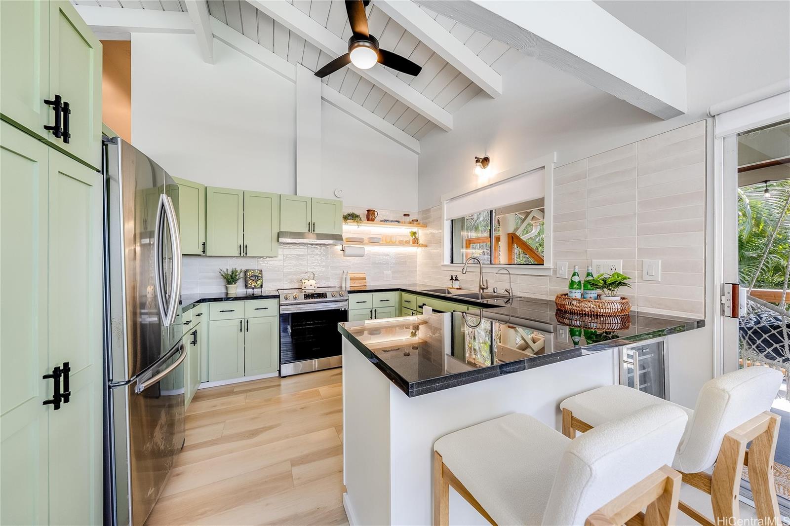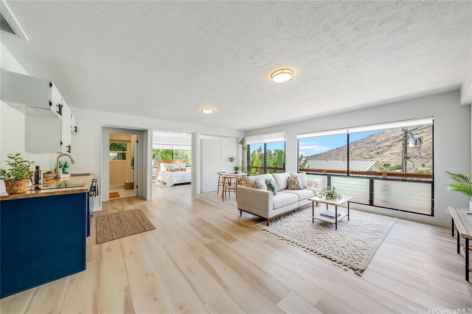 Perched between the mountains and the sea, this newly renovated Aina Haina property is a private retreat designed for active island living. The 3-bedroom, 2-bathroom main home features soaring ceilings, modern upgrades and panoramic ocean views that flow seamlessly to a wraparound lanai, perfect for enjoying your morning coffee or BBQs with friends. The well laid out kitchen is designed for those who love to cook or entertain and flows seamlessly into the open concept dining and living areas. The spacious primary suite includes two closets, a beautifully updated en suite bath and direct access to the deck to take in the serene surroundings. Split A/C's throughout and cool breezes provide year-round comfort.