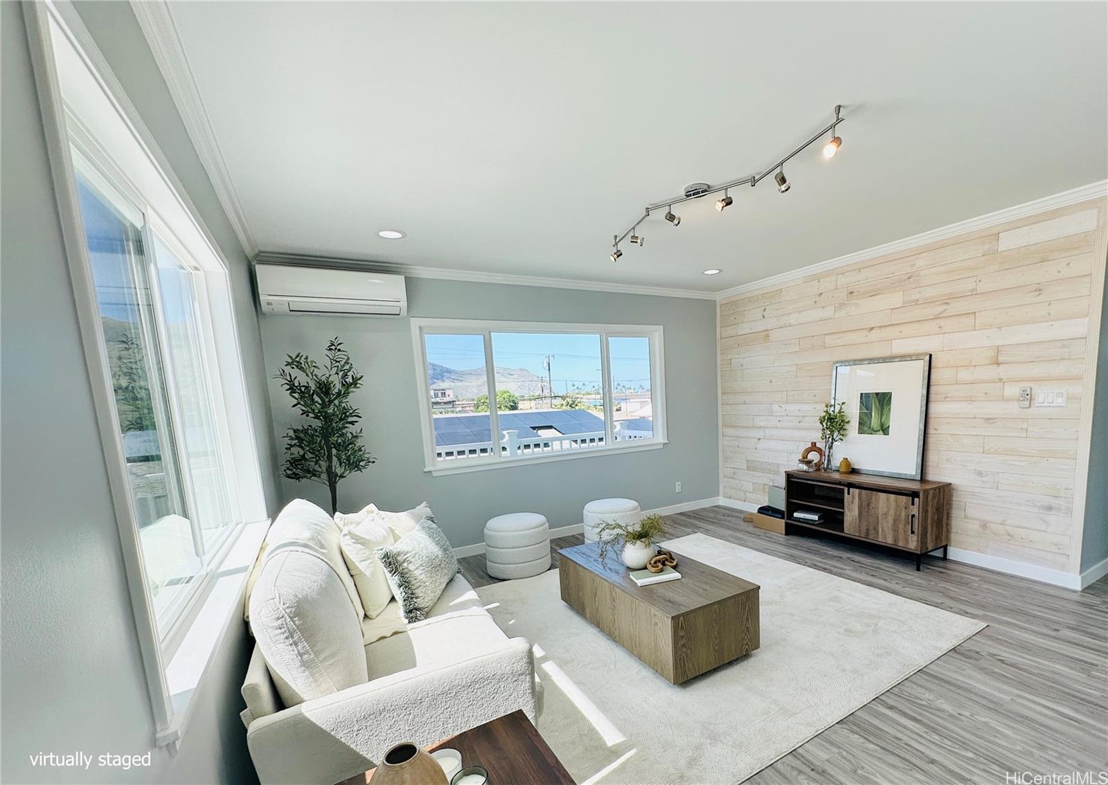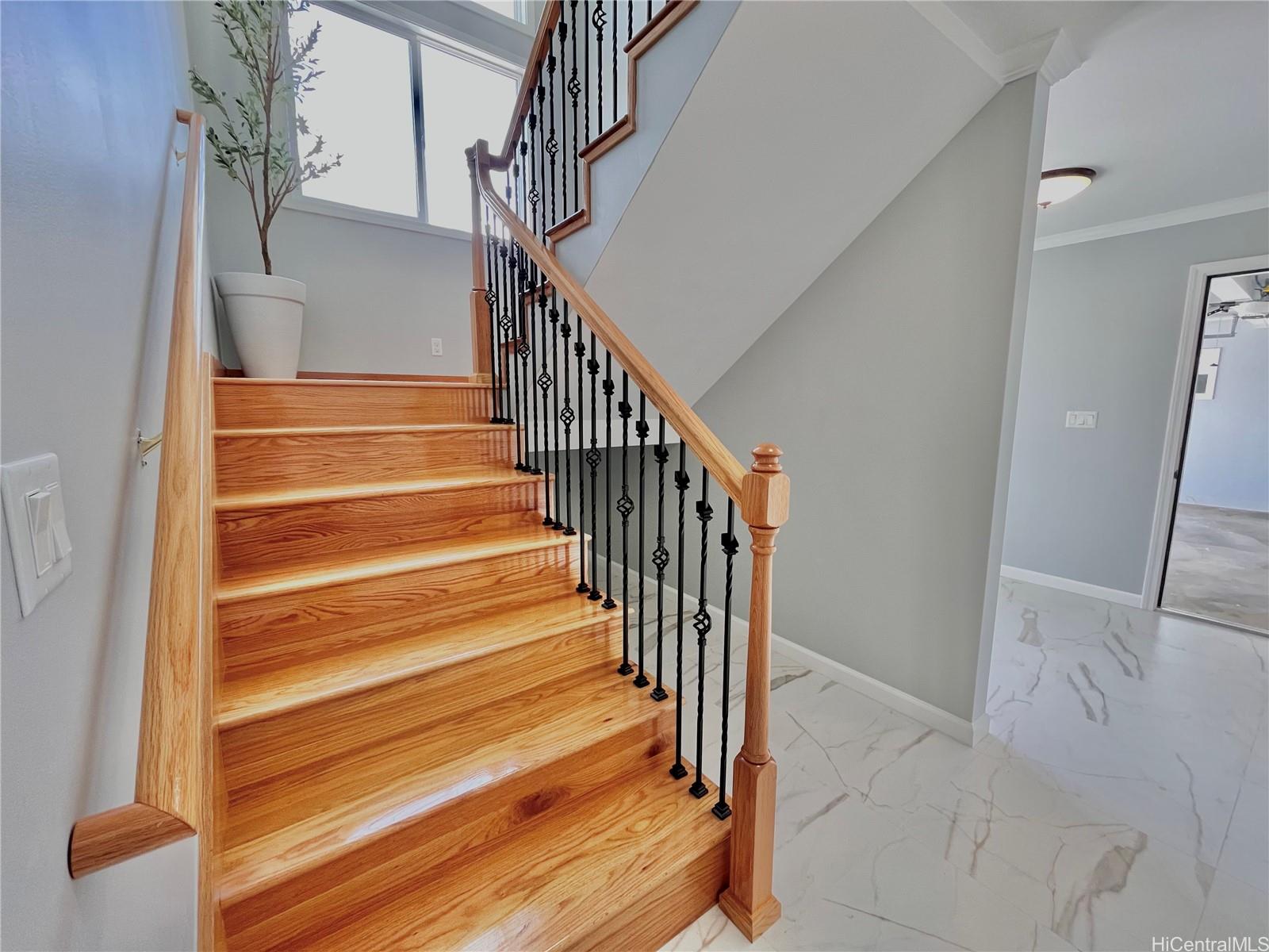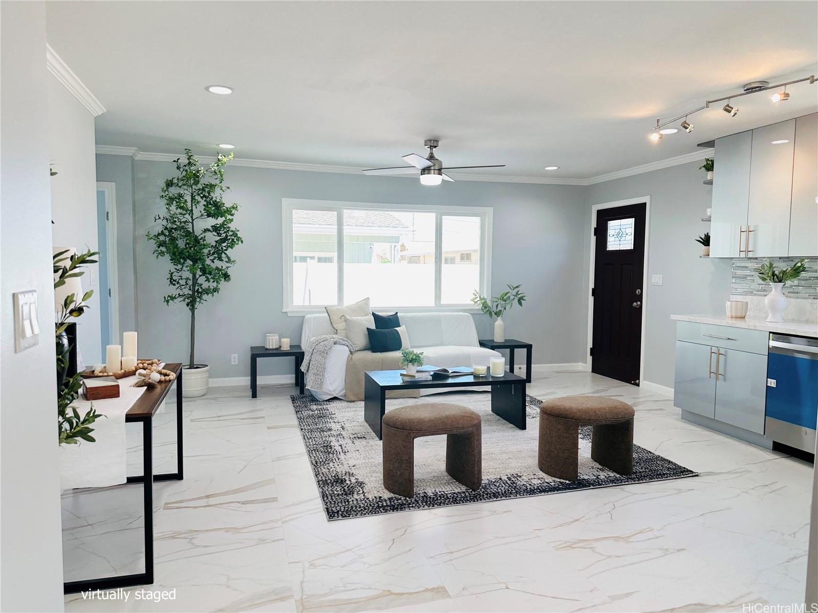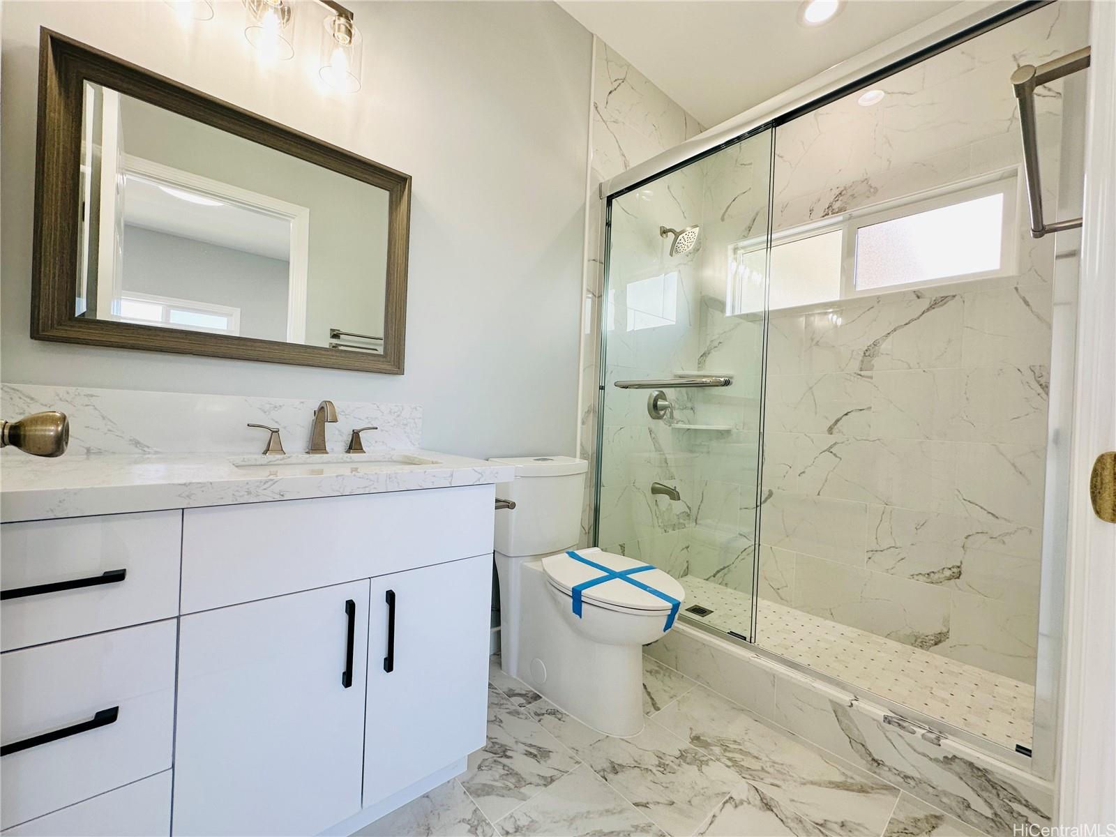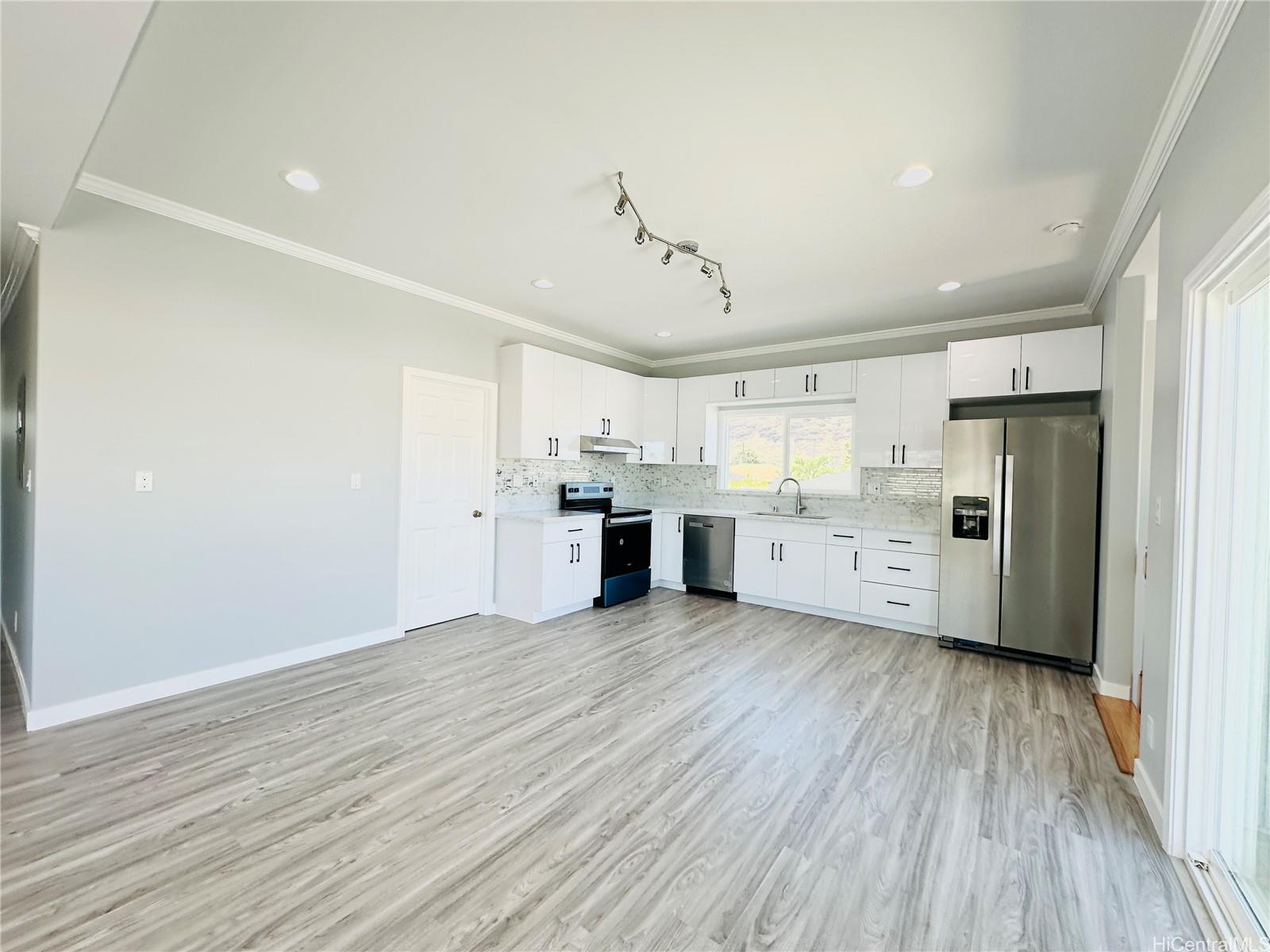 Stunning brand new constructed and beautifully designed contemporary 2-story home featuring 5 bedrooms, 4 bathrooms & 2-car garage with quality materials and finishes. Highlights include porcelain tiles, luxury vinyl plank flooring, recess lights, beautiful kitchen cabinetry & countertops, split AC, and more. This property offers a flexible floor plan, great for extended family living. Upper level: 3/2 with full kitchen, dining, living room, and a spacious open lanai for unwinding after a long day. Lower level: 2/2 with wetbar, family room, and a covered patio perfect for the backyard BBQ and entertaining. The open-concept kitchen flows effortlessly into the dining and living areas, creating the perfect space for family gatherings and lasting memories. Large spacious yard for entertaining or gardening. Fully fenced with a motorized gate for privacy. Conveniently located near shopping, schools, and minutes away from Pokai Bay Beach Park. CPR with no common area or HOA fees. Property tax not yet updated.
