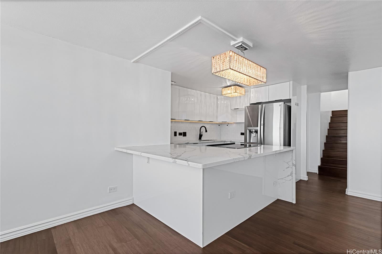 NEW PRICE! Unique 2-story split level penthouse with sweeping views with updated kitchen and bathrooms. It has a flexible upstairs loft that can serve as a third bedroom, private office, cozy reading nook, or fitness area and it opens directly onto the large deck/ lanai creating an inviting extension of your living space and the perfect spot to relax or entertain. Don't let the posted home square footage fool you. Being a 2 STORY Penthouse - it lives way bigger, so come and see for yourself! Whether you’re looking for a new home or an addition to your real estate portfolio, this unit was garnering $3,600 + /month in rental income. AC in the living room, master bedroom, and loft. It includes a stackable washer/dryer and 2 side-by-side full-sized parking stalls. Pet-friendly building (pls verify) VA-approved, 100% hurricane insured! Pearlridge Square is a well-maintained high-rise building, conveniently located just a short walk from Pearlridge Mall and Pali Momi Hospital. It’s a short drive to the airport, Pearl Harbor, freeway access, and numerous shops and eateries.Building amenities include secured entry and parking, a pool, sauna, and fitness center. Virtually staged.