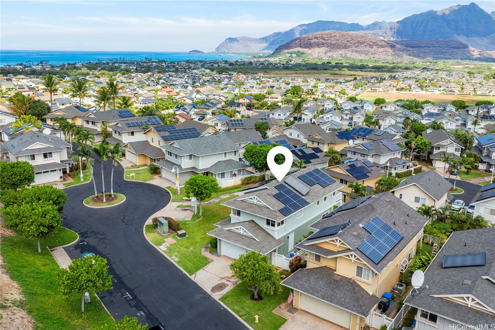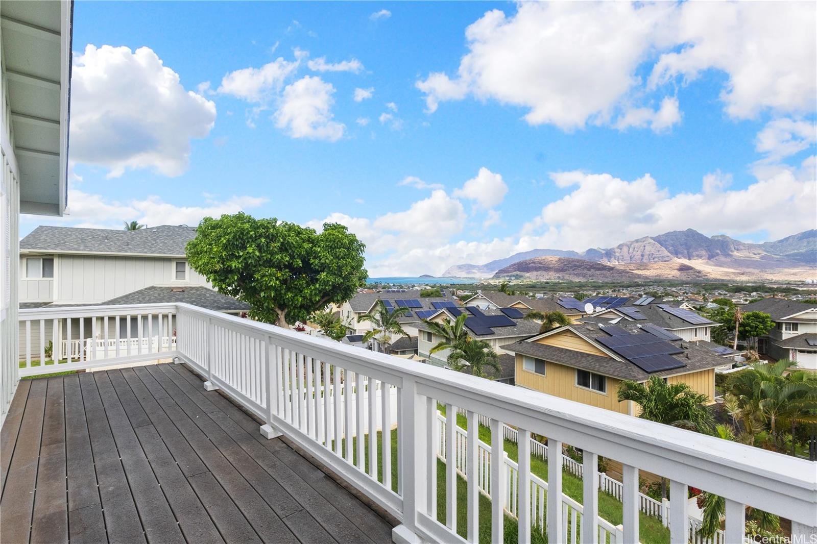 OCEAN VIEWS! Rare, large 5-bedroom, 3 bath 1,871 sq. ft. ocean view home located on a rim lot in Upper Pakeke St with no homes in front and panoramic mountain, ocean and sunset views behind. Built with upgraded DR Horton options including extra-large primary bedroom with walk-in closet, 144 sq ft deck with spectacular mountain, ocean and sunset views, and a covered downstairs patio. New roof installed in 2023, new refrigerator, remodeled custom tile shower, new baseboards, new garage door and motor, freshly painted interior, and exterior was painted in 2023. Central AC and fans throughout the home keep you cool, plus extra savings come from Solar Heater and (leased) Tesla PV System with a coveted HECO NEM (Net Metering) agreement. Serene cul-de-sac location. Sea Country is a lovely community with pool and recreation area, shops, park, and more. Maintenance fee includes front yard landscaping, sewer, water and trash. Near beaches and close to Kapolei, Oahu's "second city." Seller to credit Buyer $1,500 for deck resurfacing.