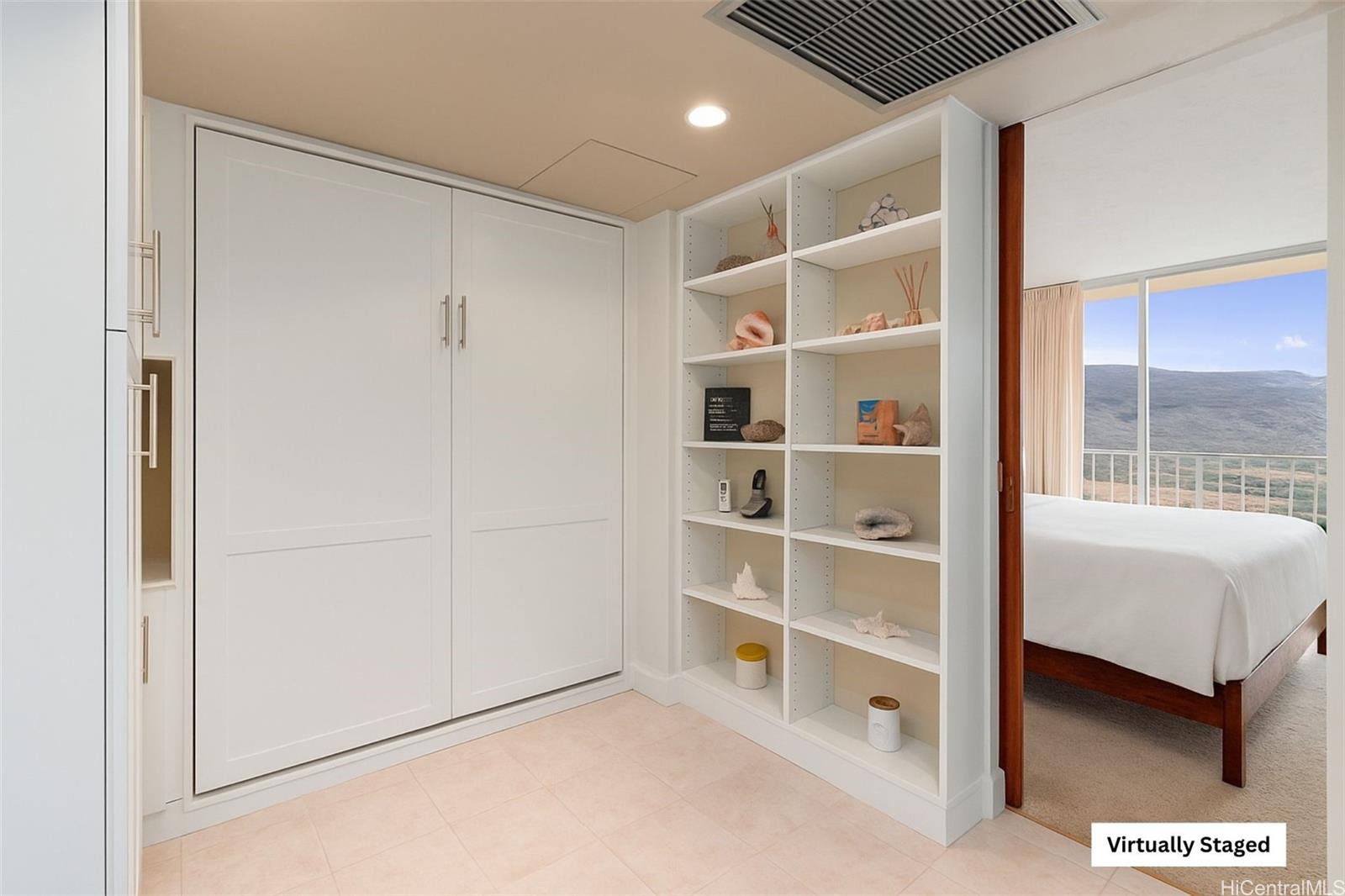 Soffits removed allowing cabinets to reach to the ceiling. Bathroom door was removed & replaced w/a 36-in. pocket door, & one dressing room closet was removed & replaced w/built-in shelving/wall unit that includes a pull-down bed. Original Shoji door replaced w/elegant solid mahogany & fogged glass, & an extra Shoji door added in bedroom for privacy.