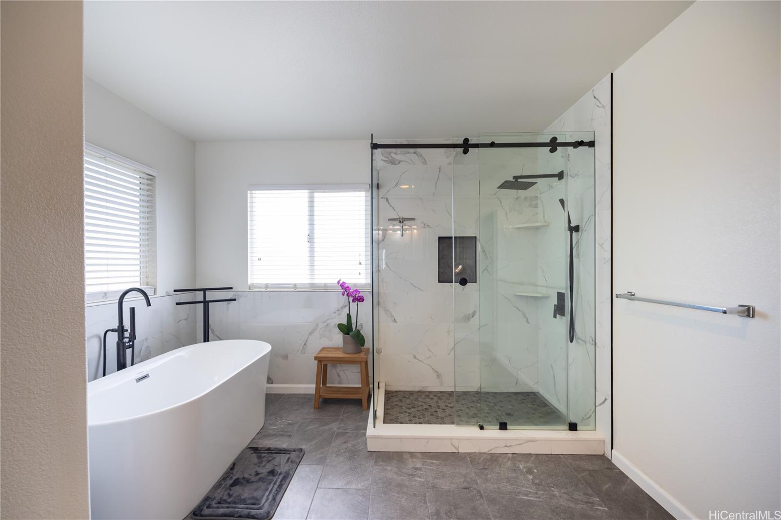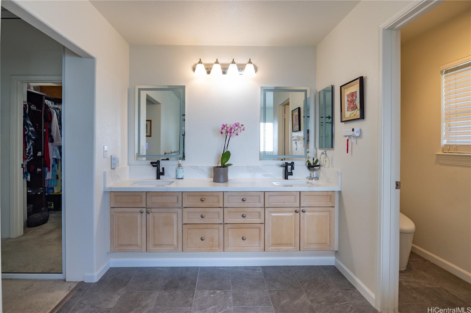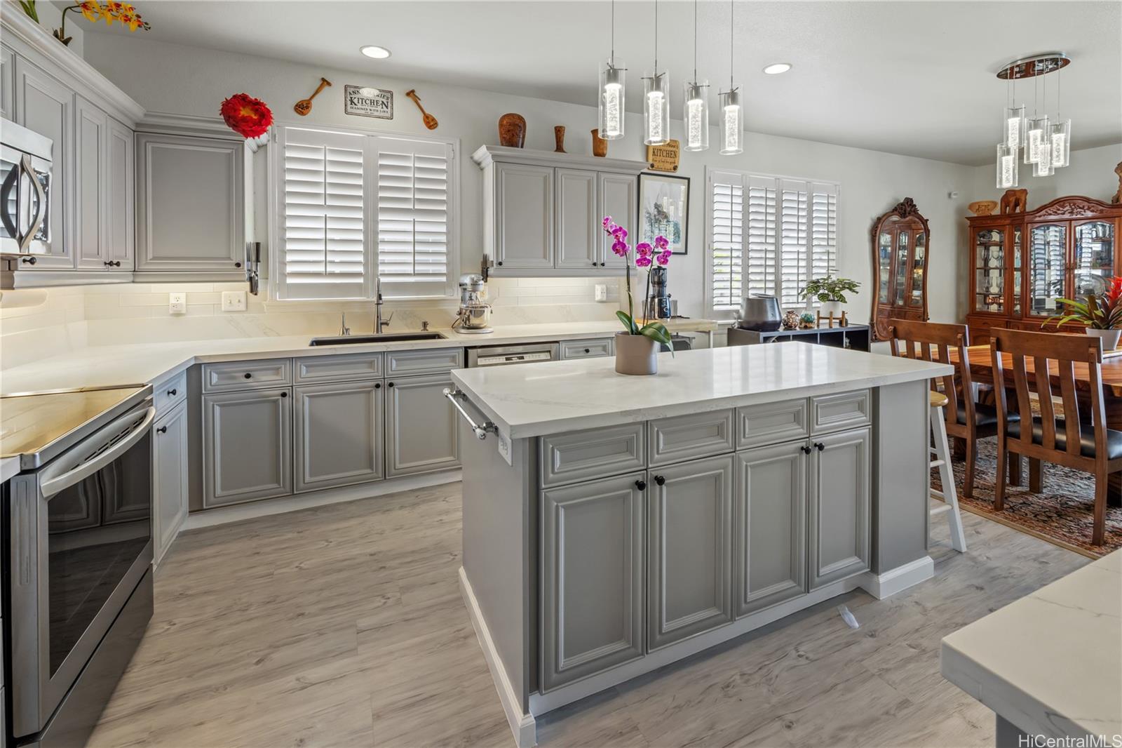 Welcome to this move-in ready home in the highly desirable Kapolei Knolls community! Recently refreshed inside and out with new paint, this beautifully updated residence blends comfort, style and modern convenience. Enjoy effortless living with an fully integrated smart home system featuring a state-of-the art security setup, intelligent climate control and premium WI-FI-enabled appliances. The home includes 34 owned solar panels that includes a battery backup in addition to the 11 existing leased solar panels-offering impressive energy efficiency. Plantation shutters and new flooring, built-in central vacuum system,Toto toilets in all bathrooms with a built-in-bidet adds a touch of elegance throughout. Designed for entertaining and relaxation, the property features an extended backyard lanai that opens to a sparkling in-ground swimming pool- a rare find in the neighborhood. Take in panoramic views of Diamond Head and the city coastline as you unwind or host gatherings. Conveniently located to schools, shopping and recreation. Take the plunge, relax and start living your island dream!