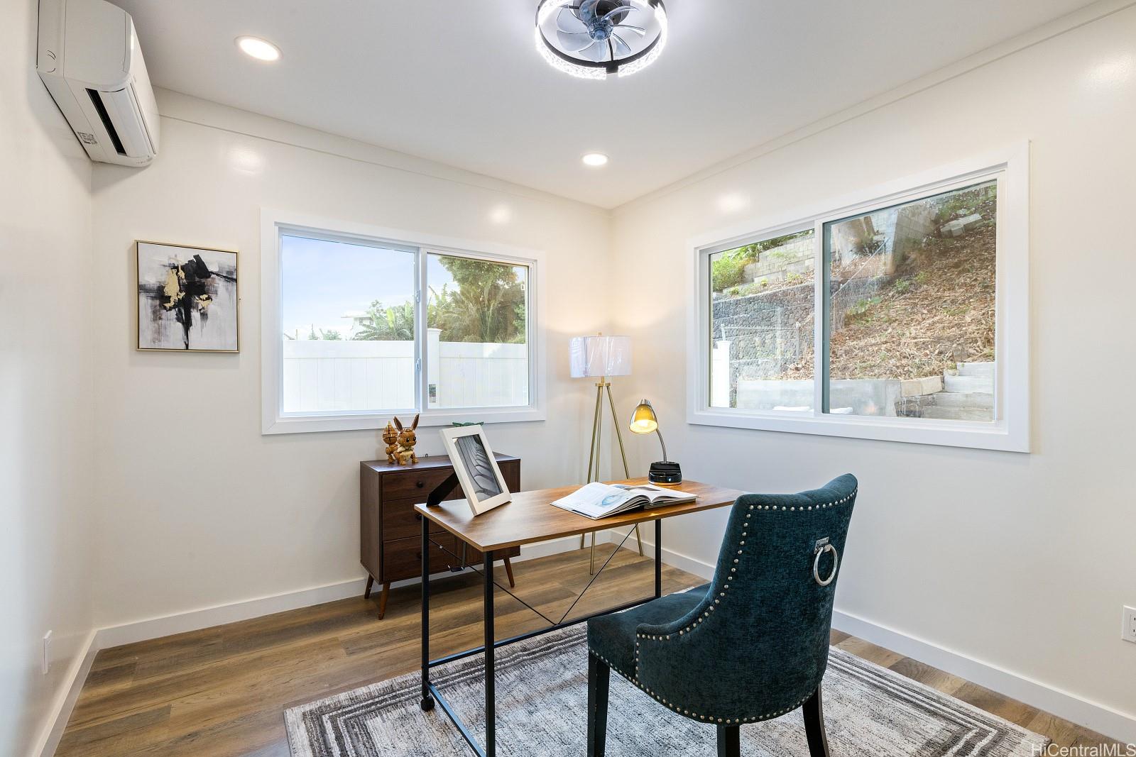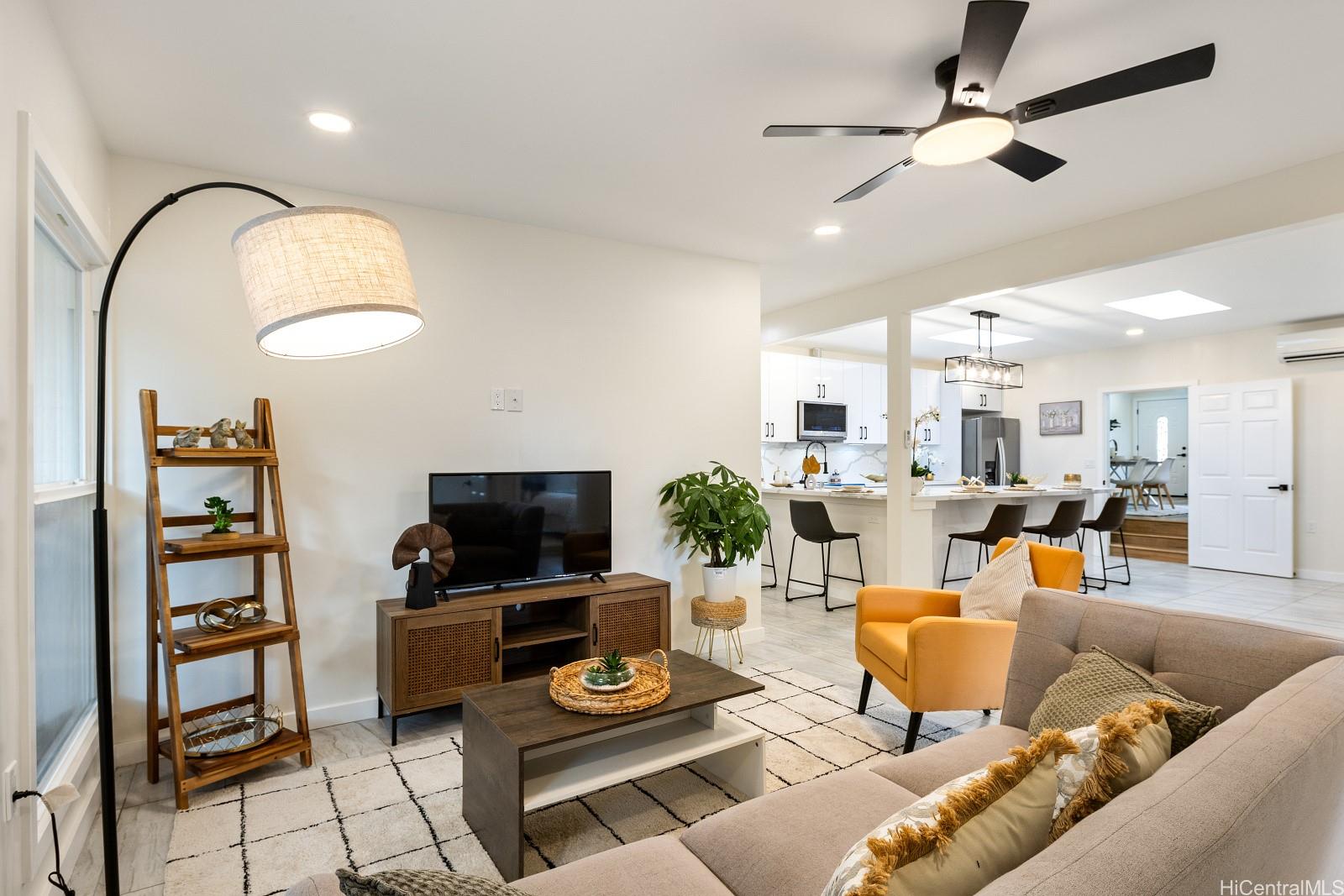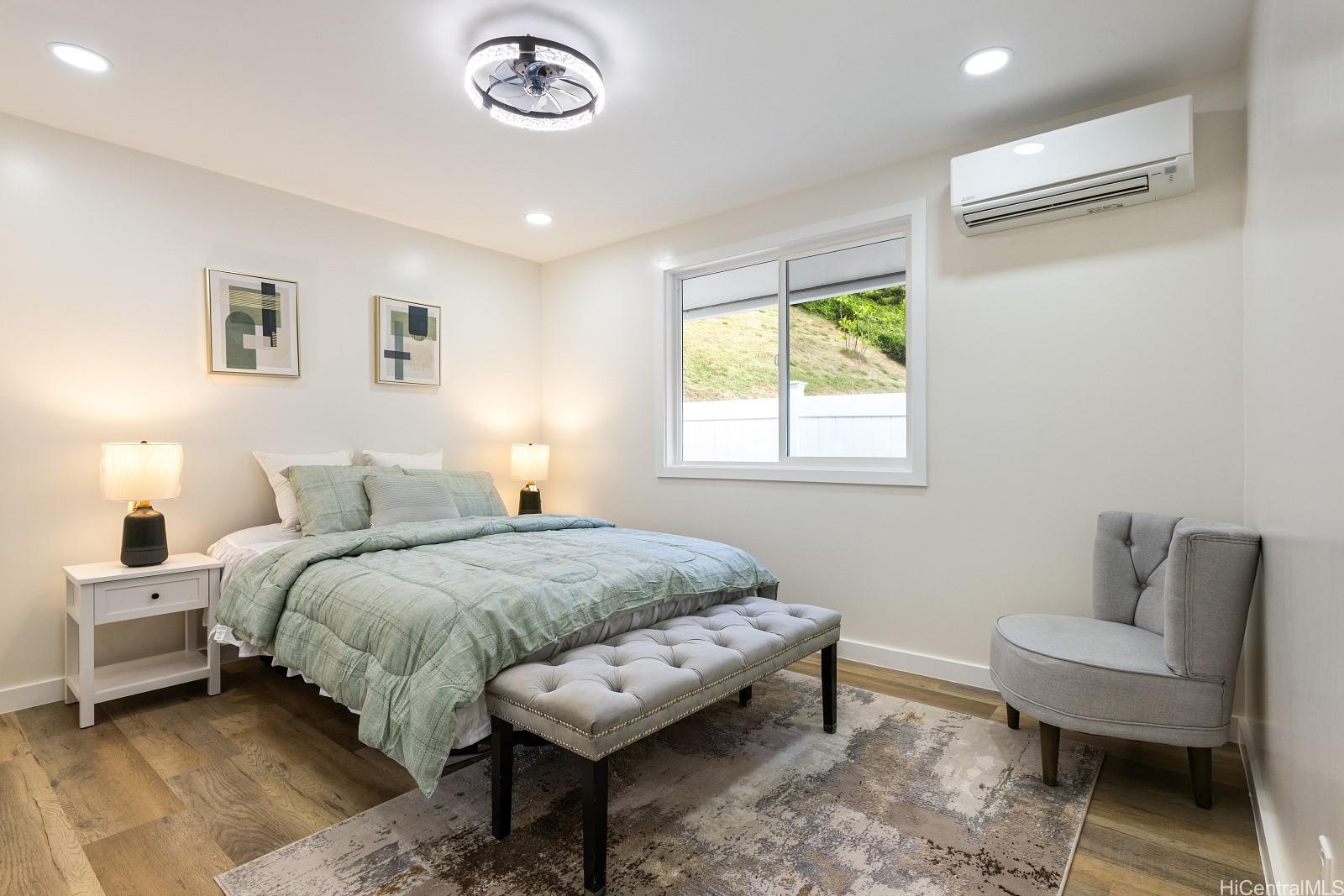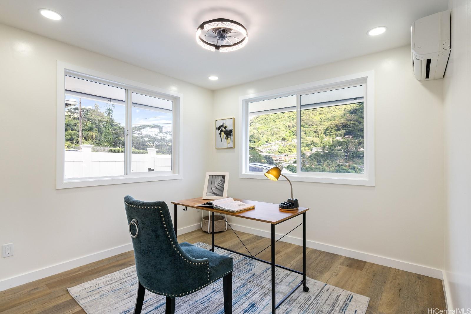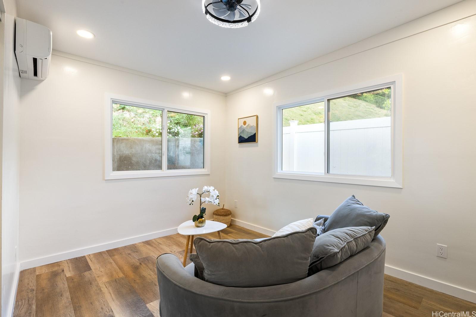 Discover this beautifully renovated 7-bedroom, 4-bath luxury home tucked away in the peaceful heart of Kalihi Valley. This rare property blends modern comfort, island charm, and multi-family versatility. Enjoy two spacious living rooms and two fully equipped kitchens with brand-new stainless steel appliances, stylish laminate flooring, and a chef’s dream U-shaped island. Each bedroom has its own split A/C for year-round comfort. Meticulously updated by a licensed contractor with proper permits, this home includes new electrical wiring and plumbing. Designed for flexibility, it offers three separate entrances—ideal for multi-family living or rental opportunities. Energy-efficient solar hot water heating adds sustainability and lowers costs. Relax or entertain on the rooftop terrace with breathtaking mountain views—perfect for yoga, barbecues, or stargazing. Outside, a tropical garden with lush greenery, vibrant flowers, two mature mango trees, and an automatic irrigation system creates your island retreat. Additional highlights include four parking stalls, ample street parking, and a quiet cul-de-sac minutes from schools, shopping, and freeway access.
