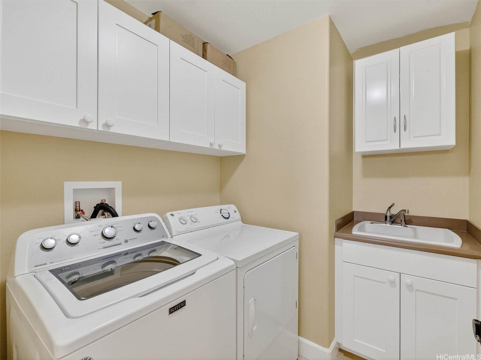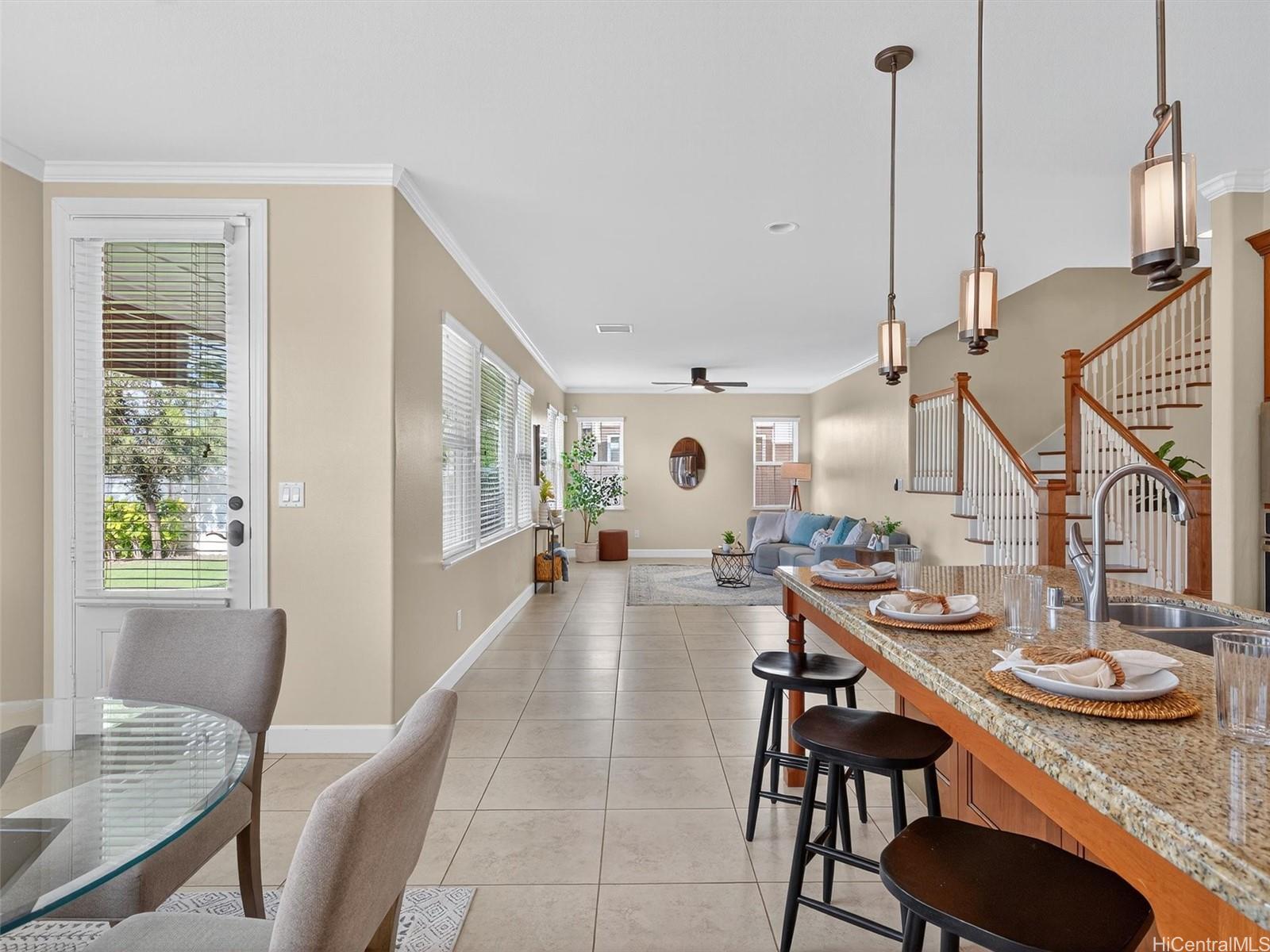 Discover relaxed island living with an elegant twist at this beautiful Ka Makana at Hoakalei residence—where your backyard opens to the Barber's Point golf course. The open layout fills the home with natural light and flows effortlessly from the living and dining areas to the backyard, creating a true indoor-outdoor experience. It’s the perfect setting to entertain, unwind, and embrace the Hawaiian lifestyle with family and friends. On the lower level, a dedicated office or study provides a quiet retreat for work or creative projects, along with a full bedroom and bath. Upstairs, the primary suite features dual walk-in closets and a spa-inspired bath, creating a serene escape for relaxation. Two additional bedrooms and a full bath complete the upper level, along with a lanai overlooking the golf course—your front-row seat to golden sunsets. This home is equipped with owned PV panels and solar water heating, helping to reduce monthly energy costs.Resort-style living awaits in Hoakalei, with a $281/month HOA that covers internet, cable, access to the community pool and tennis courts, plus the nearby Wai Kai surf and lagoon destination featuring dining, events, and vibrant community.
