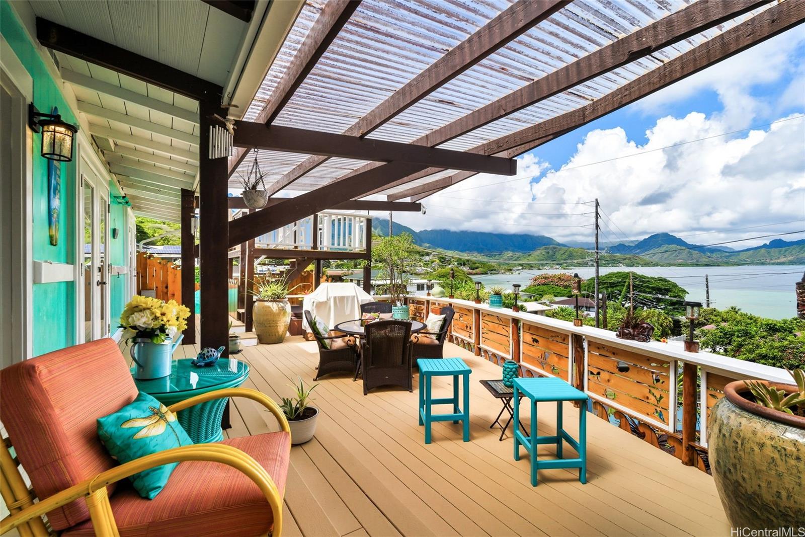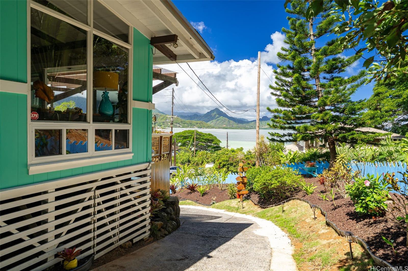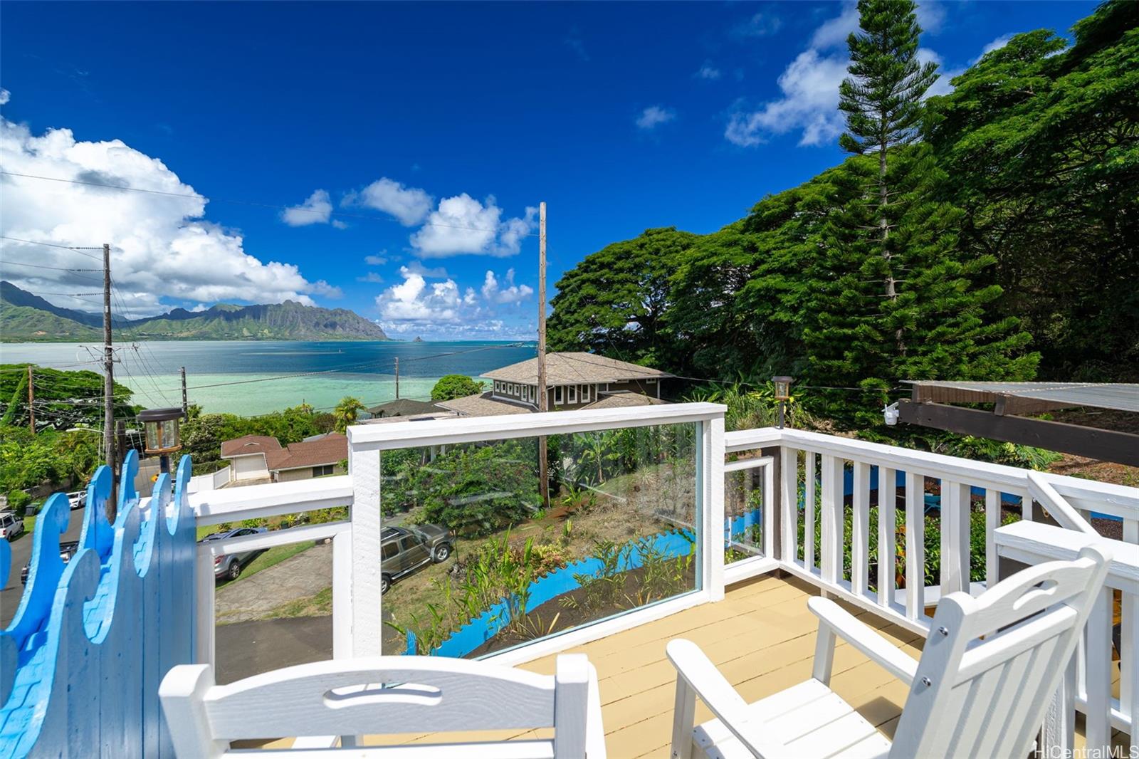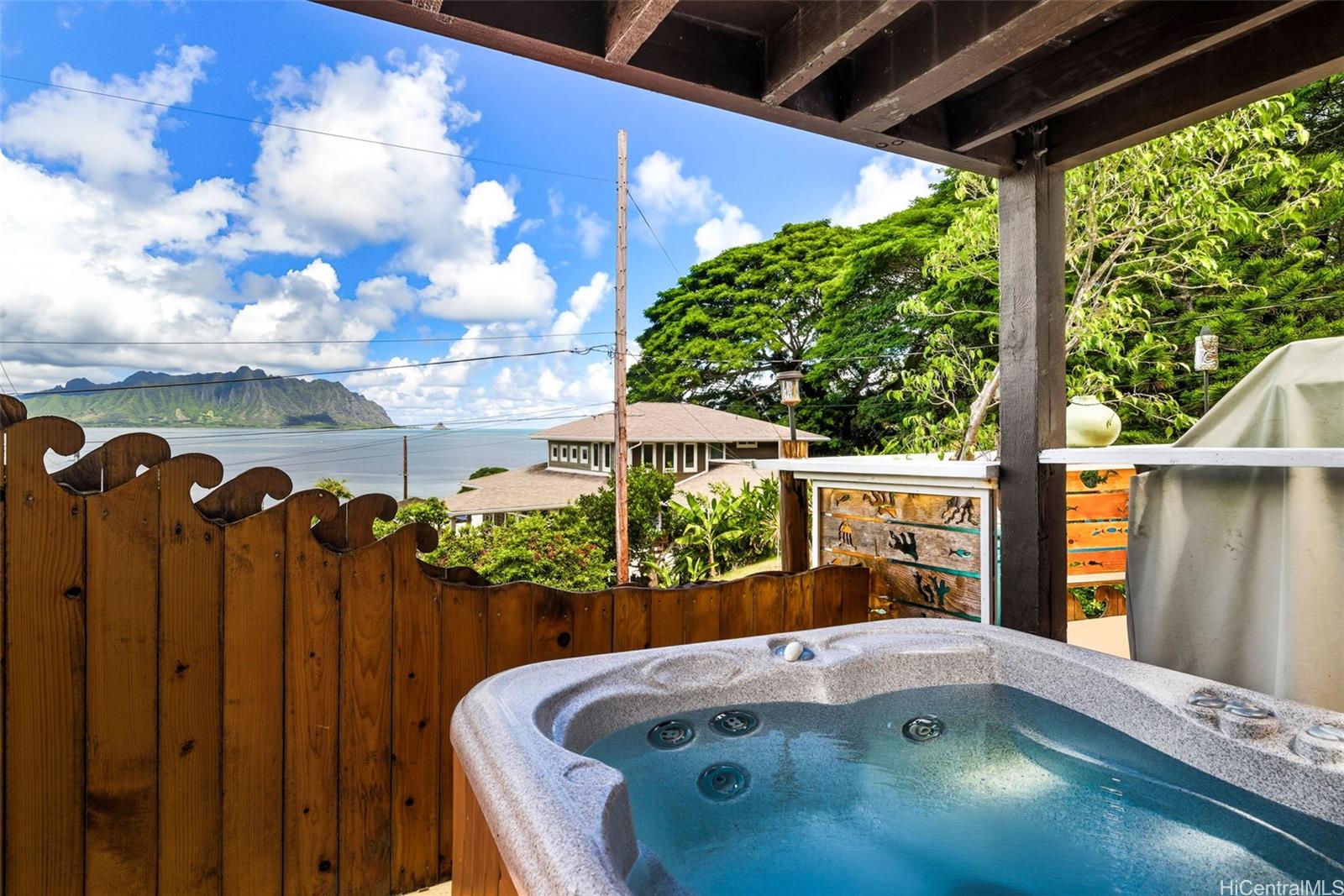 Artistic and unique island retreat in the sought-after Lulani Ocean neighborhood! Enjoy sweeping ocean/mountain views all the way to Chinaman's Hat from the expansive deck, upper-level crow's nest, or spa overlooking the ocean. There is a plethora of unique fixtures & custom finishes such as the brass w/epoxy kitchen countertops, Ohia posts in kitchen & lanai railings, nautical-inspired designs, antique entryway bricks, wood inlays w/ocean themes, decorative ocean-inspired vessel sinks, etched tropical glass, fun lighting fixtures, and more! Other features include a new roof, newer plumbing & electrical, tankless water heater, kitchen pot filler, two convention ovens, wine/beverage refrigerator, two AC wall units. Bonus items include a dwarf avocado & mango tree plus lush island landscaping. The home backs up to preservation land for privacy & the automatic gate at the driveway, in addition to 8 ARC TV cameras, provide additional security and privacy. This property is colorful, whimsical, & simply full of fun! Don't miss the level of love and attention the owners have put into this property. Just 1/2 miles to He'eia Kea Boat Harbor and minutes to Kaneohe town, schools & freeways.