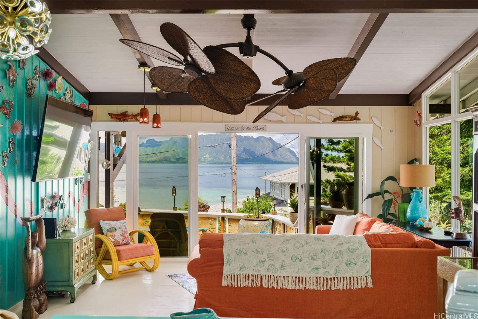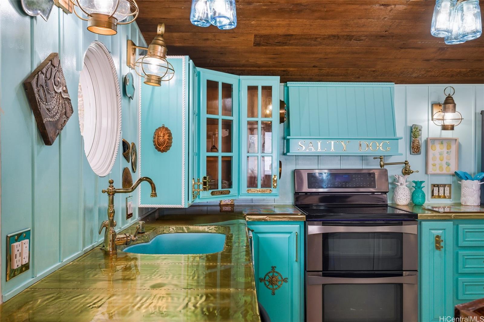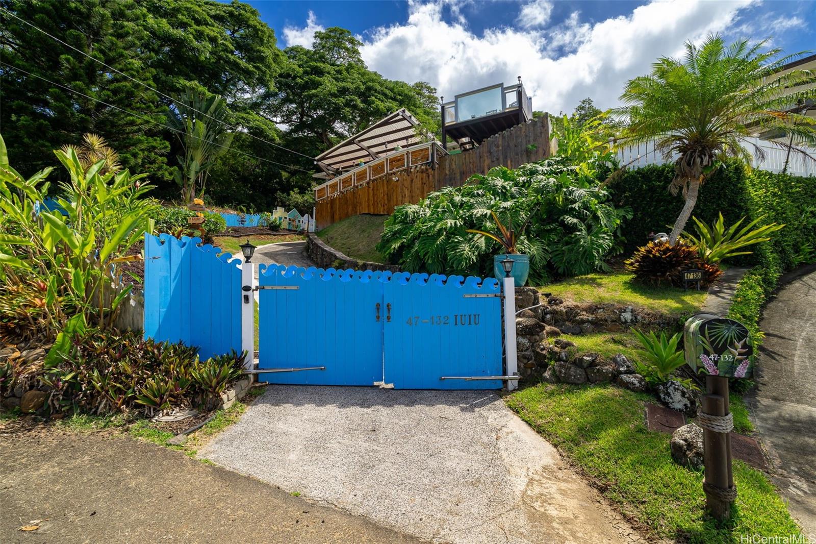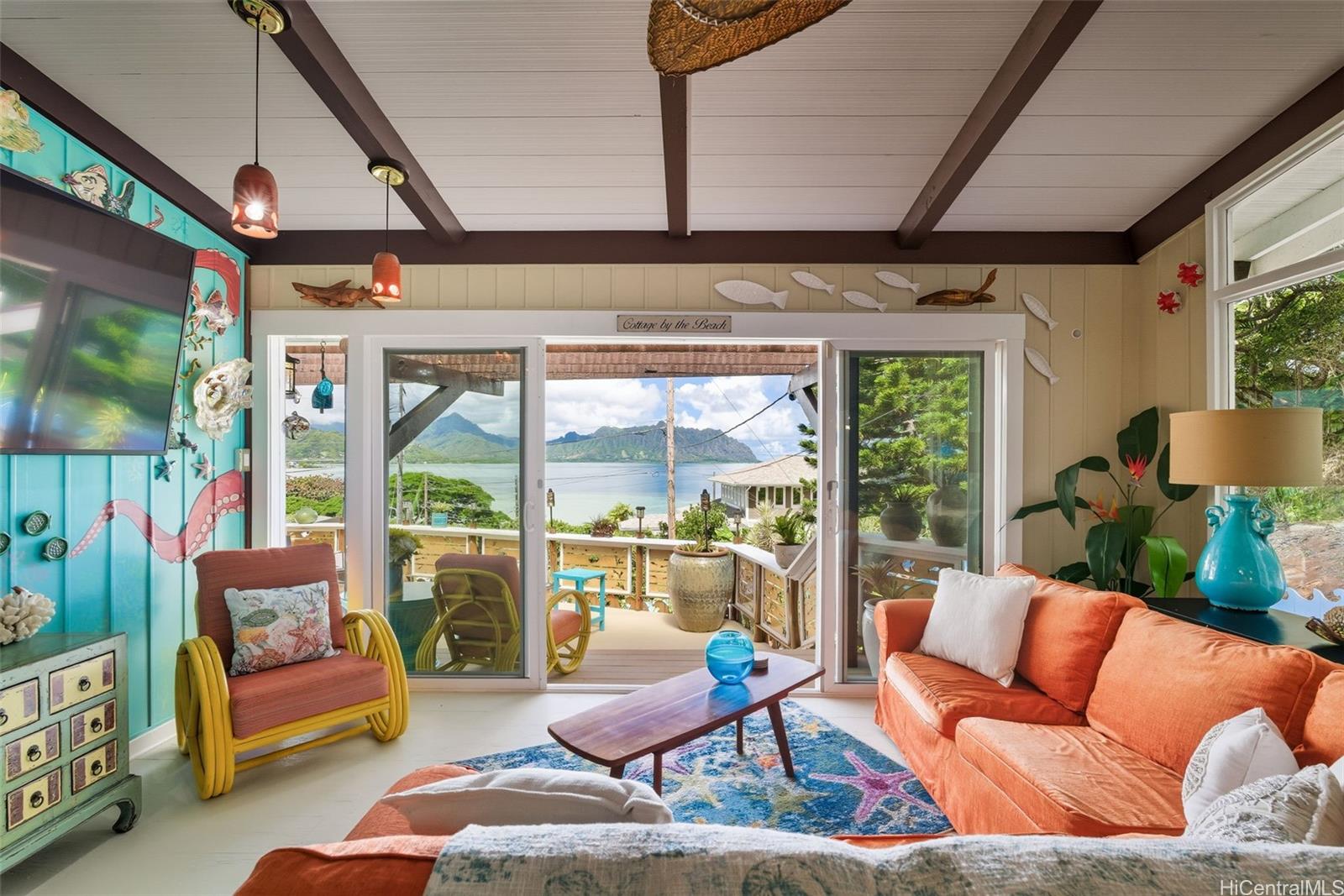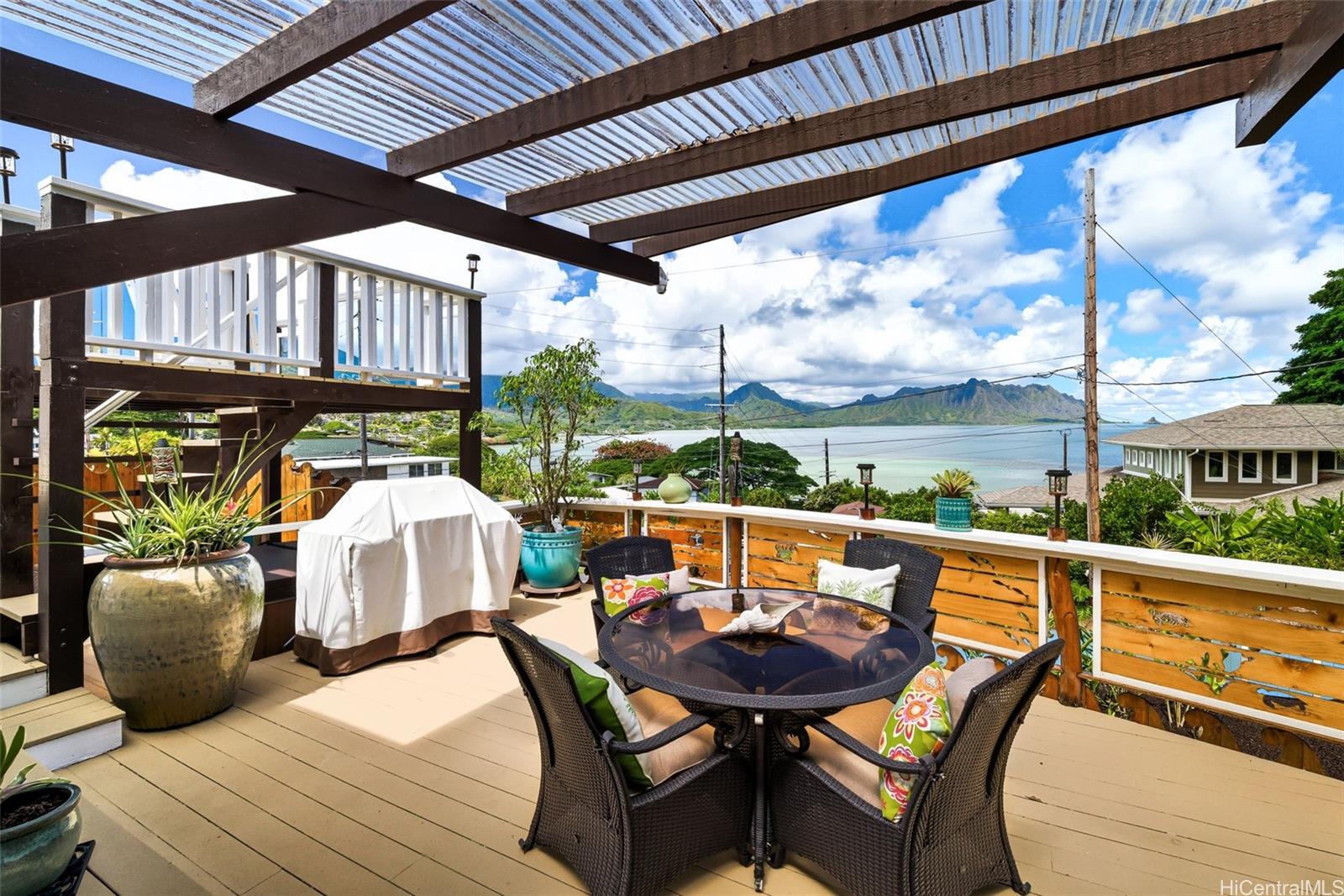 Artistic and unique island retreat in the sought-after Lulani Ocean neighborhood! Enjoy sweeping ocean/mountain views all the way to Chinaman's Hat from the expansive deck, upper-level crow's nest, or spa overlooking the ocean. There is a plethora of unique fixtures & custom finishes such as the brass w/epoxy kitchen countertops, Ohia posts in kitchen & lanai railings, nautical-inspired designs, antique entryway bricks, wood inlays w/ocean themes, decorative ocean-inspired vessel sinks, etched tropical glass, fun lighting fixtures, and more! Other features include a new roof, newer plumbing & electrical, tankless water heater, kitchen pot filler, two convention ovens, wine/beverage refrigerator, two AC wall units. Bonus items include a dwarf avocado & mango tree plus lush island landscaping. The home backs up to preservation land for privacy & the automatic gate at the driveway, in addition to 8 ARC TV cameras, provide additional security and privacy. This property is colorful, whimsical, & simply full of fun! Don't miss the level of love and attention the owners have put into this property. Just 1/2 miles to He'eia Kea Boat Harbor and minutes to Kaneohe town, schools & freeways.